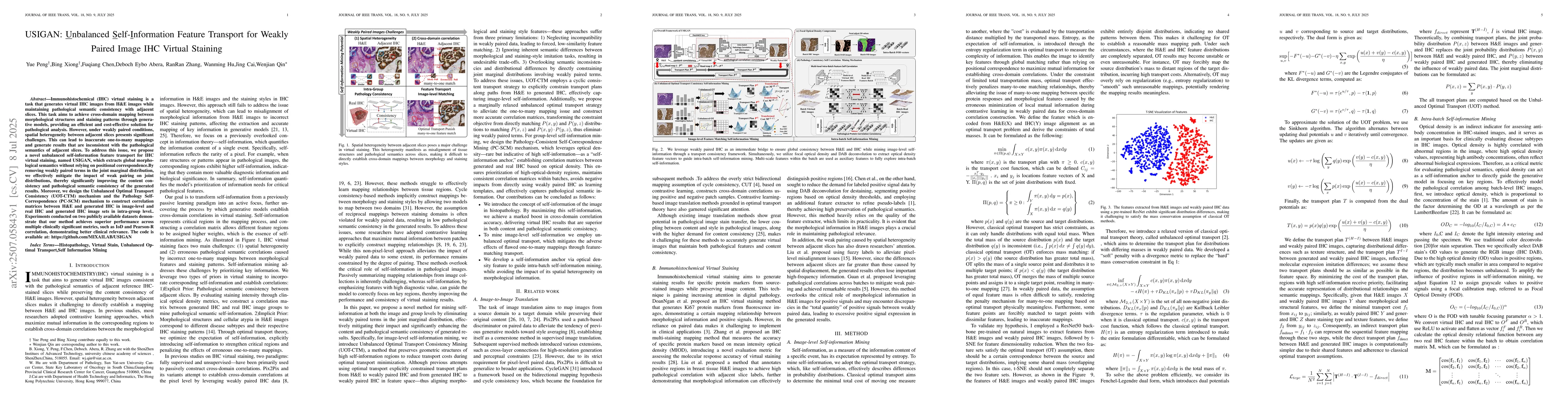Immunohistochemical (IHC) virtual staining is a task that generates virtual IHC images from H\&E images while maintaining pathological semantic consistency with adjacent slices. This task aims to achieve cross-domain mapping between morphological structures and staining patterns through generative models, providing an efficient and cost-effective solution for pathological analysis. However, under weakly paired conditions, spatial heterogeneity between adjacent slices presents significant challenges. This can lead to inaccurate one-to-many mappings and generate results that are inconsistent with the pathological semantics of adjacent slices. To address this issue, we propose a novel unbalanced self-information feature transport for IHC virtual staining, named USIGAN, which extracts global morphological semantics without relying on positional correspondence.By removing weakly paired terms in the joint marginal distribution, we effectively mitigate the impact of weak pairing on joint distributions, thereby significantly improving the content consistency and pathological semantic consistency of the generated results. Moreover, we design the Unbalanced Optimal Transport Consistency (UOT-CTM) mechanism and the Pathology Self-Correspondence (PC-SCM) mechanism to construct correlation matrices between H\&E and generated IHC in image-level and real IHC and generated IHC image sets in intra-group level.. Experiments conducted on two publicly available datasets demonstrate that our method achieves superior performance across multiple clinically significant metrics, such as IoD and Pearson-R correlation, demonstrating better clinical relevance.