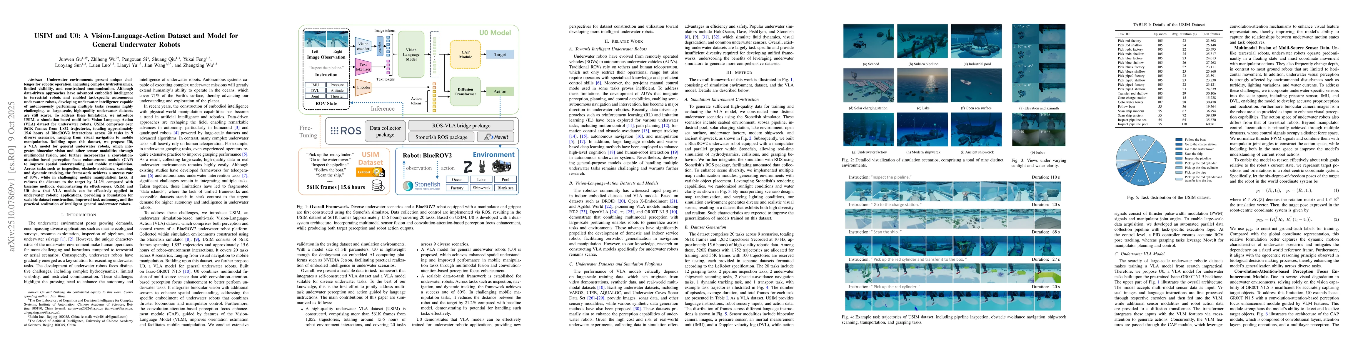 The research presents USIM, a large-scale simulation-based multi-task dataset, and U0, a Vision-Language-Action model for underwater robots. It leverages binocular vision, multimodal sensor fusion, and a convolution-attention-based perception focus enhancement module to improve task execution.