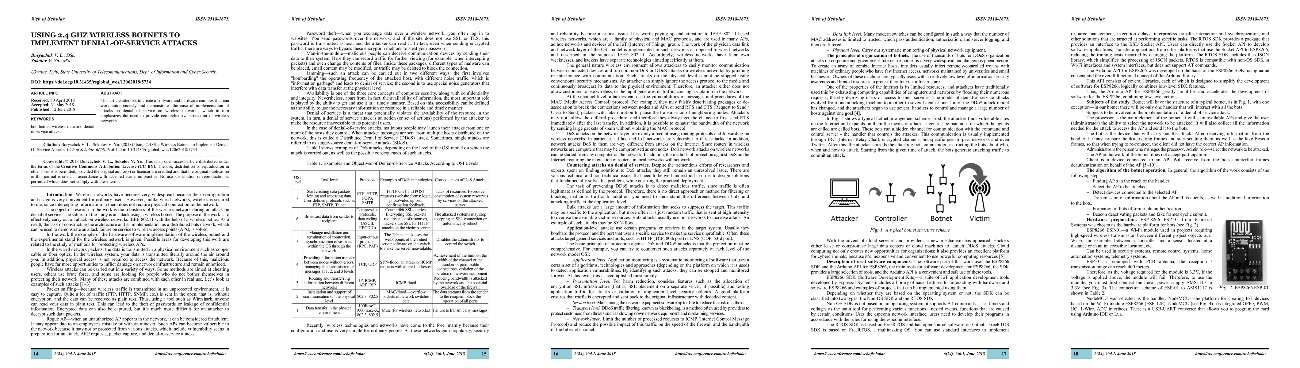 Summary: This paper constructs a system utilizing 2.4 GHz wireless botnets to execute denial-of-service attacks, highlighting the vulnerability of wireless networks and stressing the necessity for robust security measures.