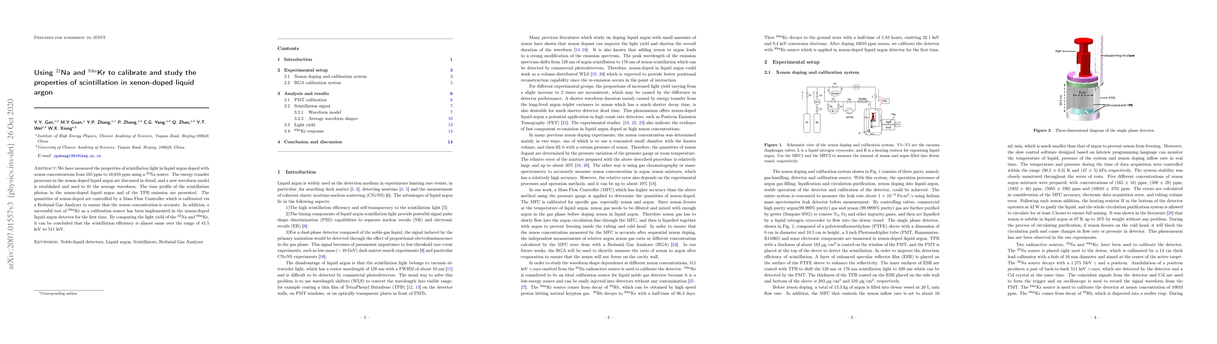 This study measures scintillation light in xenon-doped liquid argon using a $^{22}$Na source and establishes a new waveform model to analyze the energy transfer processes. The $^{83{\rm m}}$Kr source is successfully tested for calibration, showing similar scintillation efficiency across a range of energies from 41.5 keV to 511 keV.