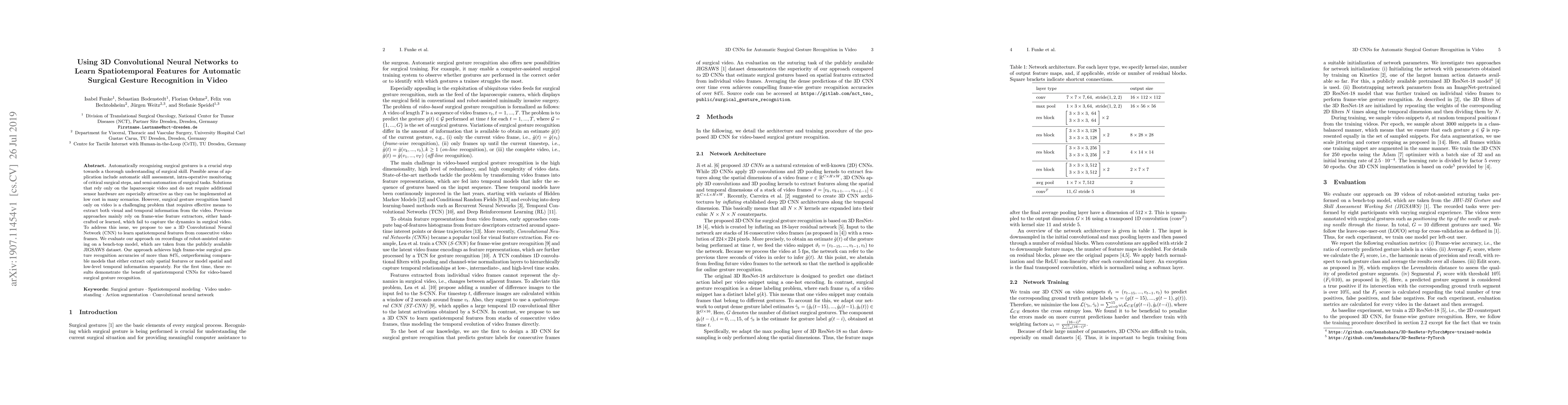 This paper proposes using 3D Convolutional Neural Networks (CNNs) to extract spatiotemporal features from video for automatic surgical gesture recognition, achieving high accuracy of over 84%. The method outperforms previous models by effectively capturing the dynamics in surgical videos without requiring additional sensor hardware.