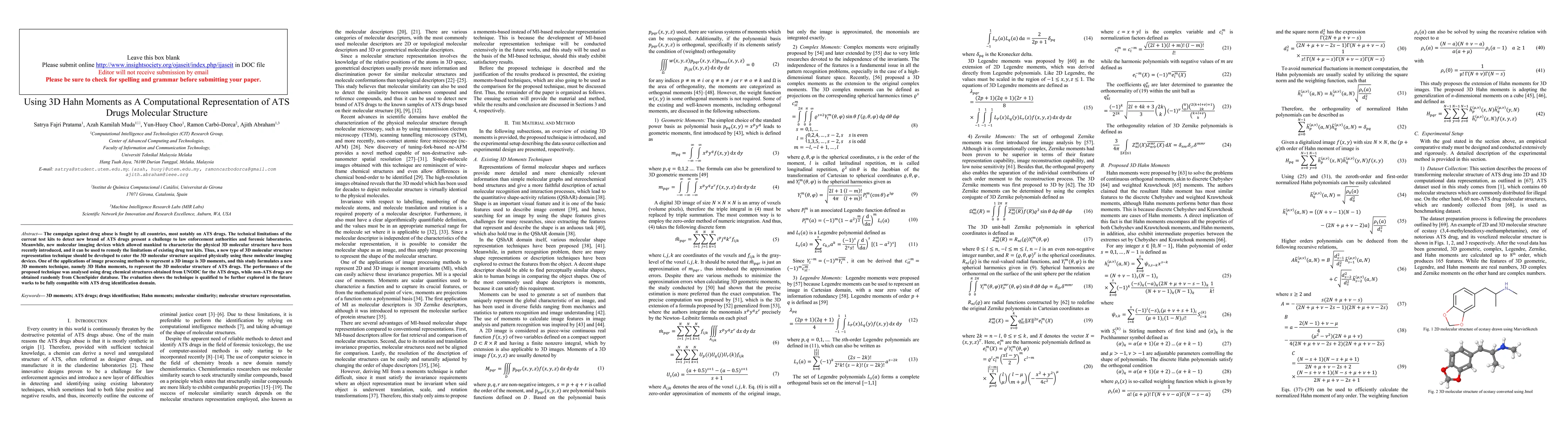 The campaign against drug abuse is fought by all countries, most notably on ATS drugs. The technical limitations of the current test kits to detect new brand of ATS drugs present a challenge to law enforcement authorities and forensic laboratories. Meanwhile, new molecular imaging devices which allowed mankind to characterize the physical 3D molecular structure have been recently introduced, and it can be used to remedy the limitations of existing drug test kits. Thus, a new type of 3D molecular structure representation technique should be developed to cater the 3D molecular structure acquired physically using these molecular imaging devices. One of the applications of image processing methods to represent a 3D image is 3D moments, and this study formulates a new 3D moments technique, namely 3D Hahn moments, to represent the 3D molecular structure of ATS drugs. The performance of the proposed technique was analysed using drug chemical structures obtained from UNODC for the ATS drugs, while non-ATS drugs are obtained randomly from ChemSpider database. The evaluation shows the technique is qualified to be further explored in the future works to be fully compatible with ATS drug identification domain.