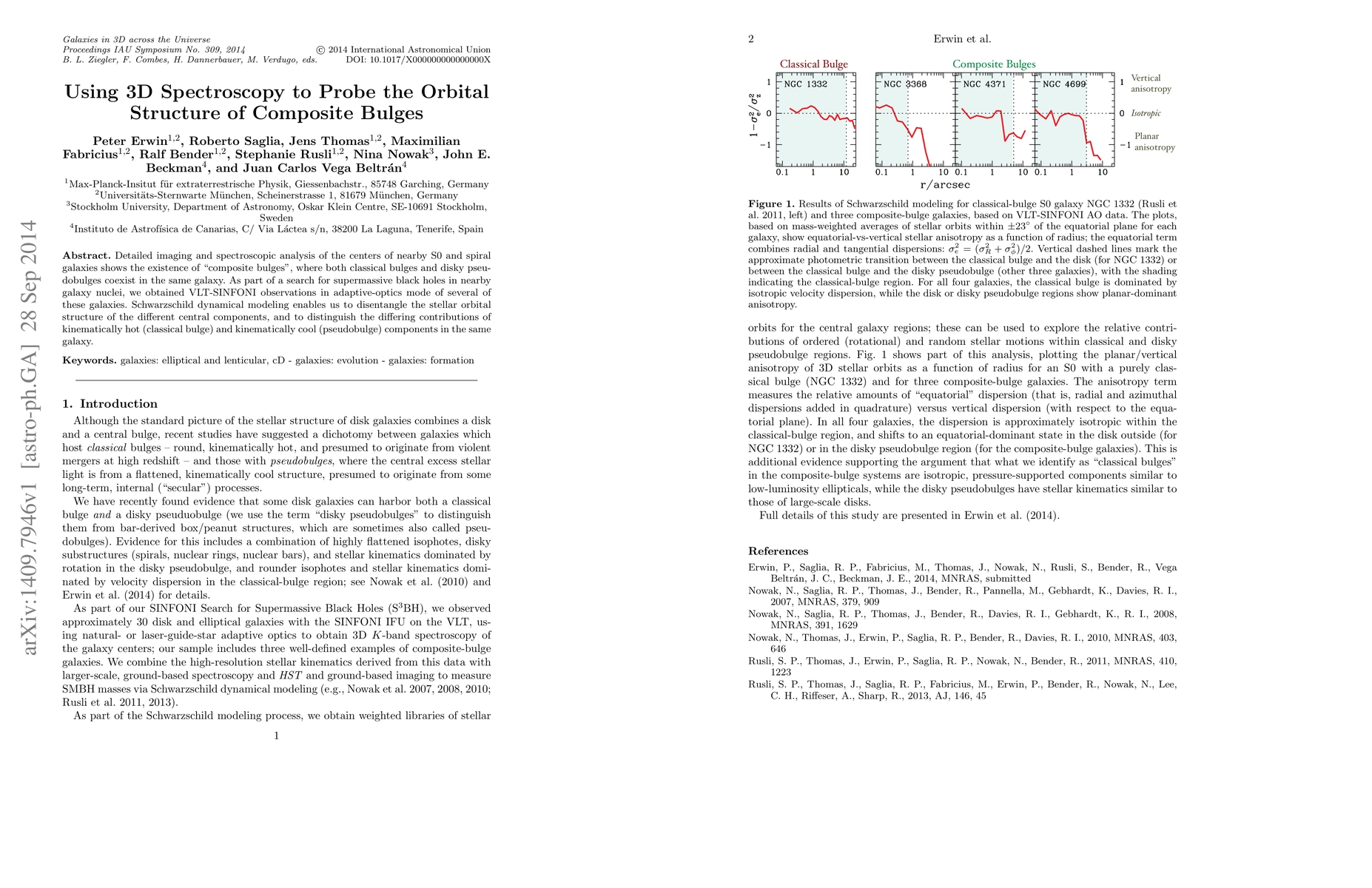 This paper uses 3D spectroscopy from VLT-SINFONI to analyze the orbital structure of composite bulges in nearby S0 and spiral galaxies, revealing distinct contributions from classical and pseudobulge components through adaptive-optics modeling. The study aims to identify supermassive black holes and understand the dynamics of galaxy nuclei.