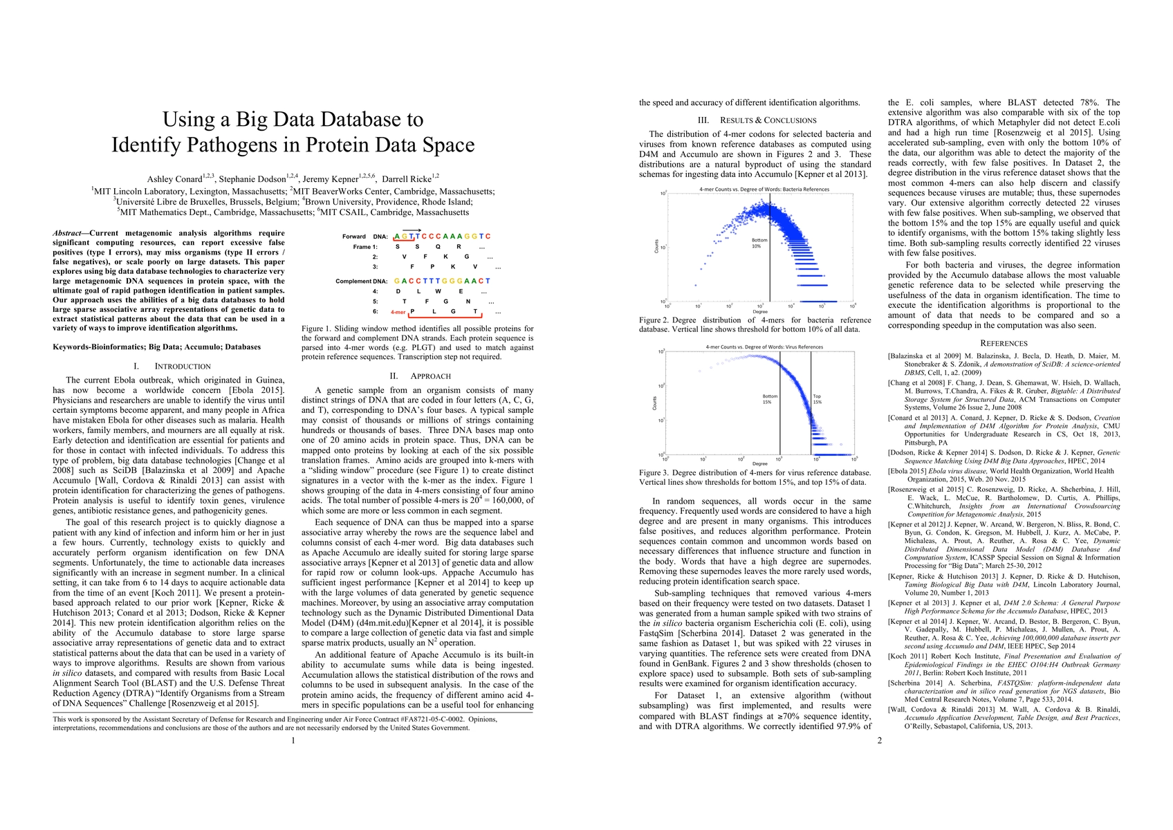 This paper investigates leveraging big data database technologies to enhance the identification of pathogens in large-scale metagenomic DNA sequences by utilizing sparse associative arrays for improved statistical pattern extraction. The goal is to develop more efficient and accurate pathogen identification algorithms for patient samples.