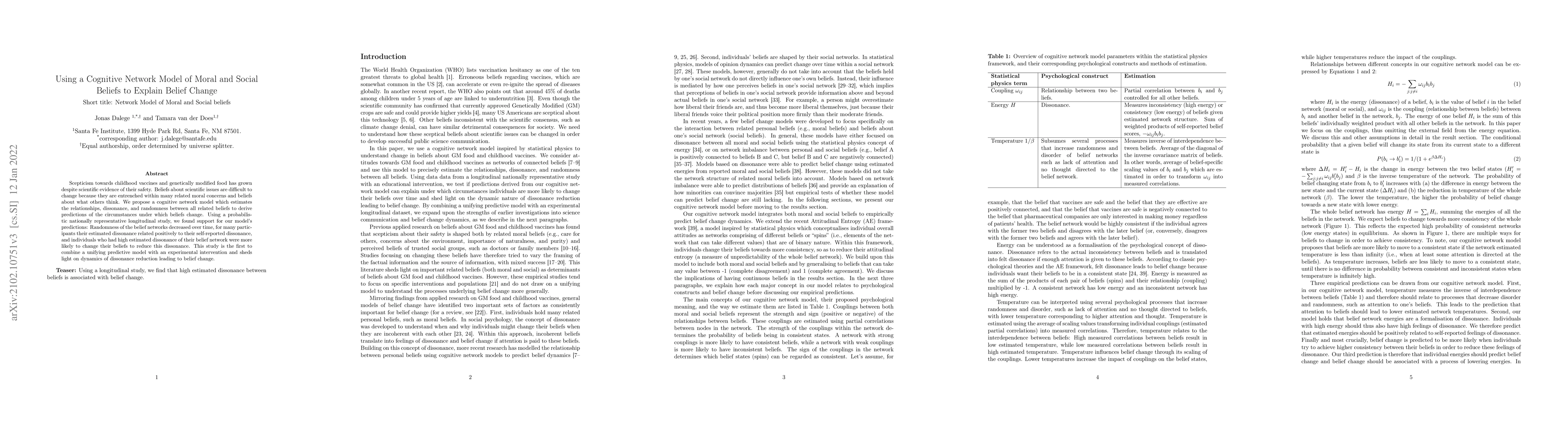 Scepticism towards childhood vaccines and genetically modified food has grown despite scientific evidence of their safety. Beliefs about scientific issues are difficult to change because they are entrenched within many related moral concerns and beliefs about what others think. We propose a cognitive network model which estimates the relationships, dissonance, and randomness between all related beliefs to derive predictions of the circumstances under which beliefs change. Using a probabilistic nationally representative longitudinal study, we found support for our model's predictions: Randomness of the belief networks decreased over time, for many participants their estimated dissonance related positively to their self-reported dissonance, and individuals who had high estimated dissonance of their belief network were more likely to change their beliefs to reduce this dissonance. This study is the first to combine a unifying predictive model with an experimental intervention and sheds light on dynamics of dissonance reduction leading to belief change.