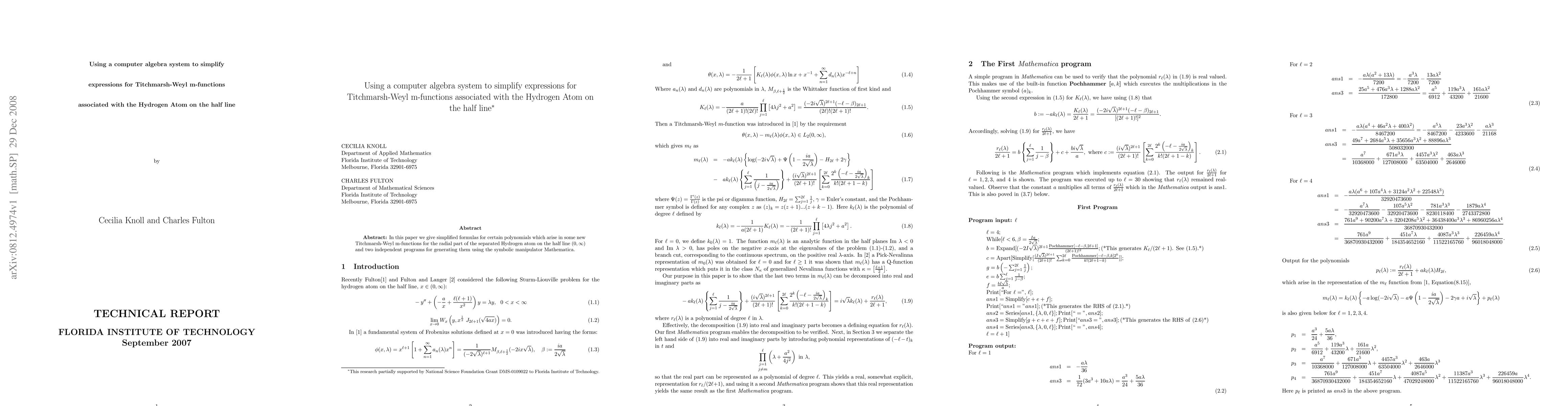 This paper presents simplified expressions for polynomials related to Titchmarsh-Weyl m-functions of the Hydrogen atom on the half line, achieved using the computer algebra system Mathematica. It offers two independent programs for generating these polynomials, making complex calculations more accessible.