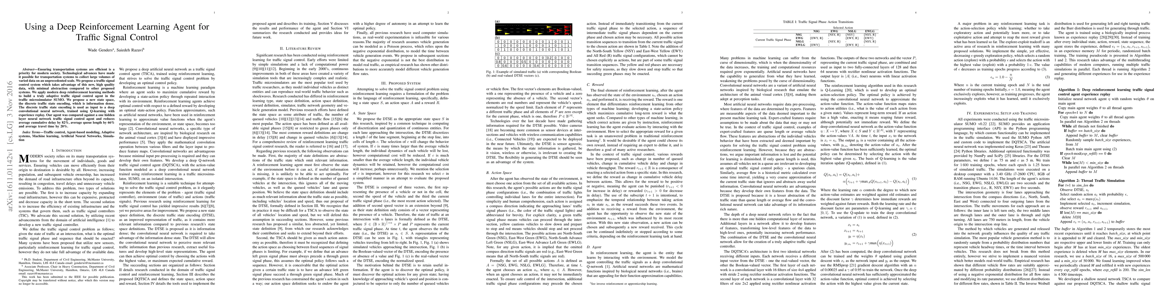 This paper proposes a deep reinforcement learning agent for adaptive traffic signal control, utilizing a new state space encoding and a deep convolutional neural network trained with Q-learning. The agent significantly outperforms a traditional neural network in reducing delays, queue lengths, and travel times.