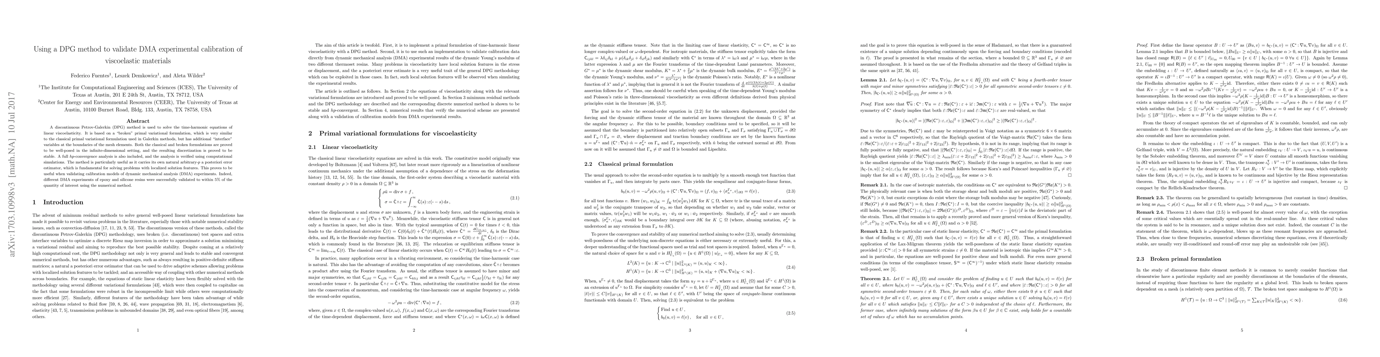 A discontinuous Petrov-Galerkin (DPG) method is used to solve the time-harmonic equations of linear viscoelasticity. It is based on a "broken" primal variational formulation, which is very similar to the classical primal variational formulation used in Galerkin methods, but has additional "interface" variables at the boundaries of the mesh elements. Both the classical and broken formulations are proved to be well-posed in the infinite-dimensional setting, and the resulting discretization is proved to be stable. A full $hp$-convergence analysis is also included, and the analysis is verified using computational simulations. The method is particularly useful as it carries its own natural arbitrary-$p$ a posteriori error estimator, which is fundamental for solving problems with localized solution features. This proves to be useful when validating calibration models of dynamic mechanical analysis (DMA) experiments. Indeed, different DMA experiments of epoxy and silicone resins were successfully validated to within $5\%$ of the quantity of interest using the numerical method.