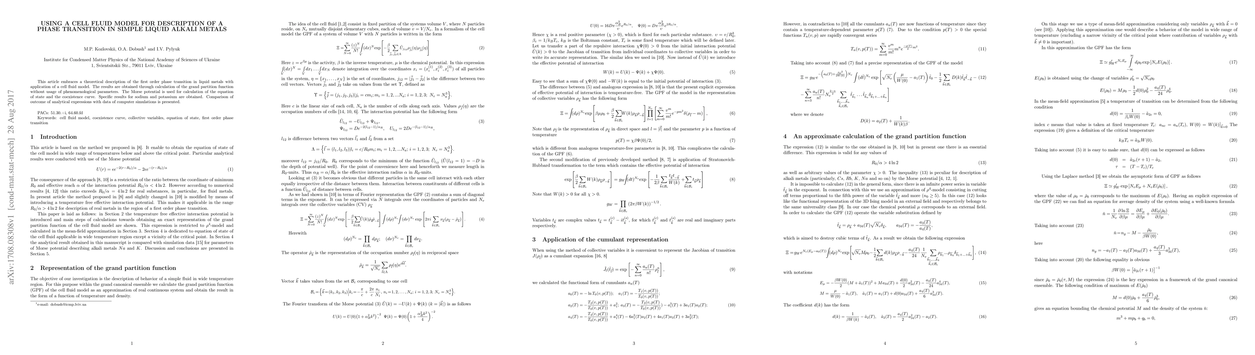 This article embraces a theoretical description of the first order phase transition in liquid metals with application of a cell fluid model. The results are obtained through calculation of the grand partition function without usage of phenomenological parameters. The Morse potential is used for calculation of the equation of state and the coexistence curve. Specific results for sodium and potassium are obtained. Comparison of outcome of analytical expressions with data of computer simulations is presented.