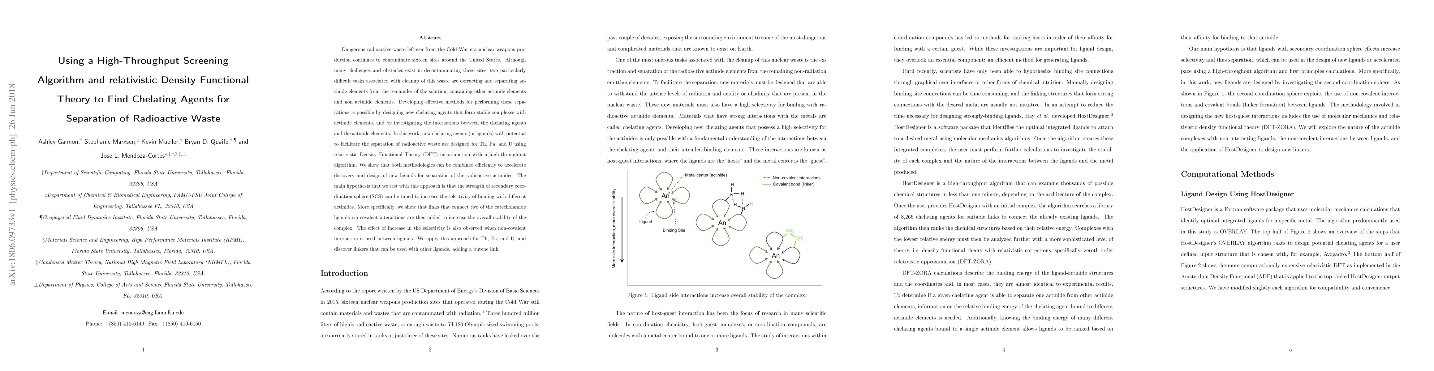 Dangerous radioactive waste leftover from the Cold War era nuclear weapons production continues to contaminate sixteen sites around the United States. Although many challenges and obstacles exist in decontaminating these sites, two particularly difficult tasks associated with cleanup of this waste are extracting and separating actinide elements from the remainder of the solution, containing other actinide elements and non actinide elements. Developing effective methods for performing these separations is possible by designing new chelating agents that form stable complexes with actinide elements, and by investigating the interactions between the chelating agents and the actinide elements. In this work, new chelating agents (or ligands) with potential to facilitate the separation of radioactive waste are designed for Th, Pa, and U using relativistic Density Functional Theory (DFT) inconjunction with a high-throughput algorithm. We show that both methodologies can be combined efficiently to accelerate discovery and design of new ligands for separation of the radioactive actinides. The main hypothesis that we test with this approach is that the strength of secondary coordination sphere (SCS) can be tuned to increase the selectivity of binding with different actinides. More specifically, we show that links that connect two of the catecholamide ligands via covalent interactions are then added to increase the overall stability of the complex. The effect of increase in the selectivity is also observed when non-covalent interaction is used between ligands. We apply this approach for Th, Pa, and U, and discover linkers that can be used with other ligands.