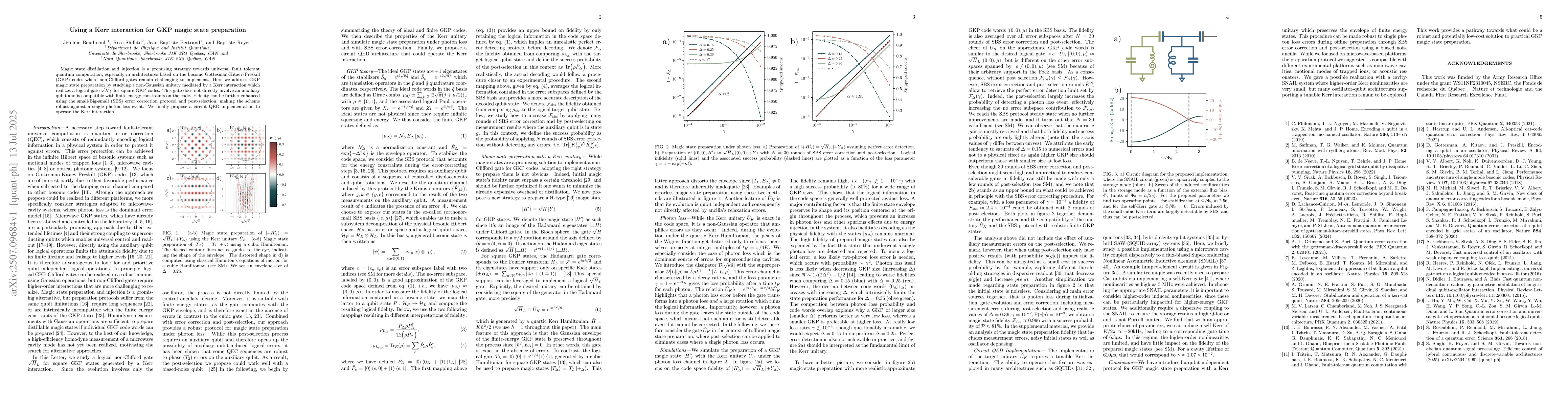 Magic state distillation and injection is a promising strategy towards universal fault tolerant quantum computation, especially in architectures based on the bosonic Gottesman-Kitaev-Preskill (GKP) codes where non-Clifford gates remain challenging to implement. Here we address GKP magic state preparation by studying a non-Gaussian unitary mediated by a Kerr interaction which realizes a logical gate $\sqrt{H}_L$ for square GKP codes. This gate does not directly involve an auxiliary qubit and is compatible with finite energy constraints on the code. Fidelity can be further enhanced using the small-Big-small (SBS) error correction protocol and post-selection, making the scheme robust against a single photon loss event. We finally propose a circuit QED implementation to operate the Kerr interaction.