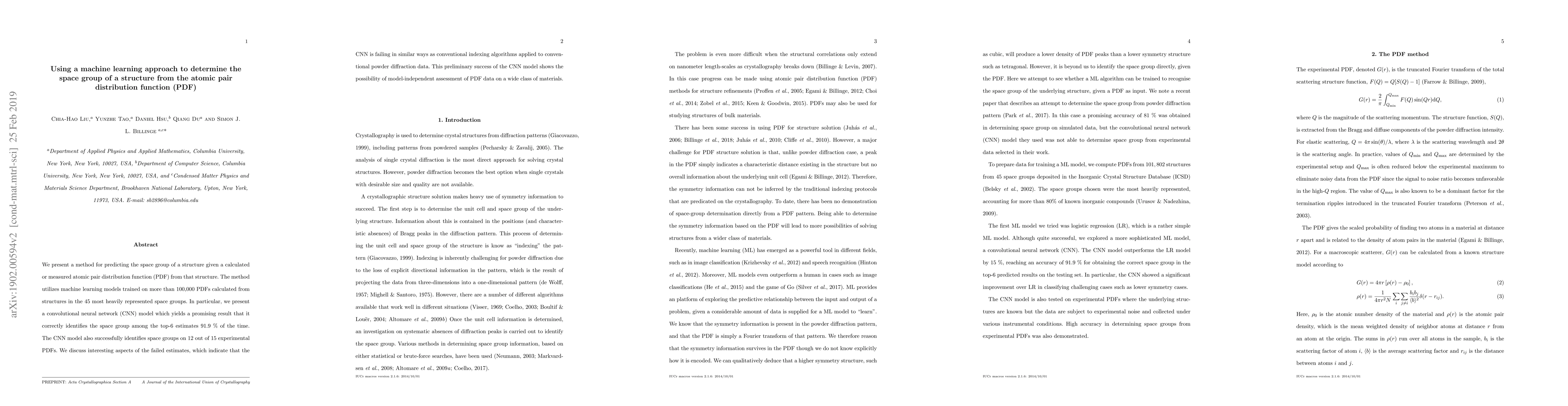 This paper introduces a machine learning method, specifically a convolutional neural network (CNN), to predict the space group of a structure from the atomic pair distribution function (PDF). The CNN model, trained on over 100,000 PDFs, correctly identifies the space group among the top-6 estimates 91.9% of the time and successfully applies to 12 out of 15 experimental PDFs.