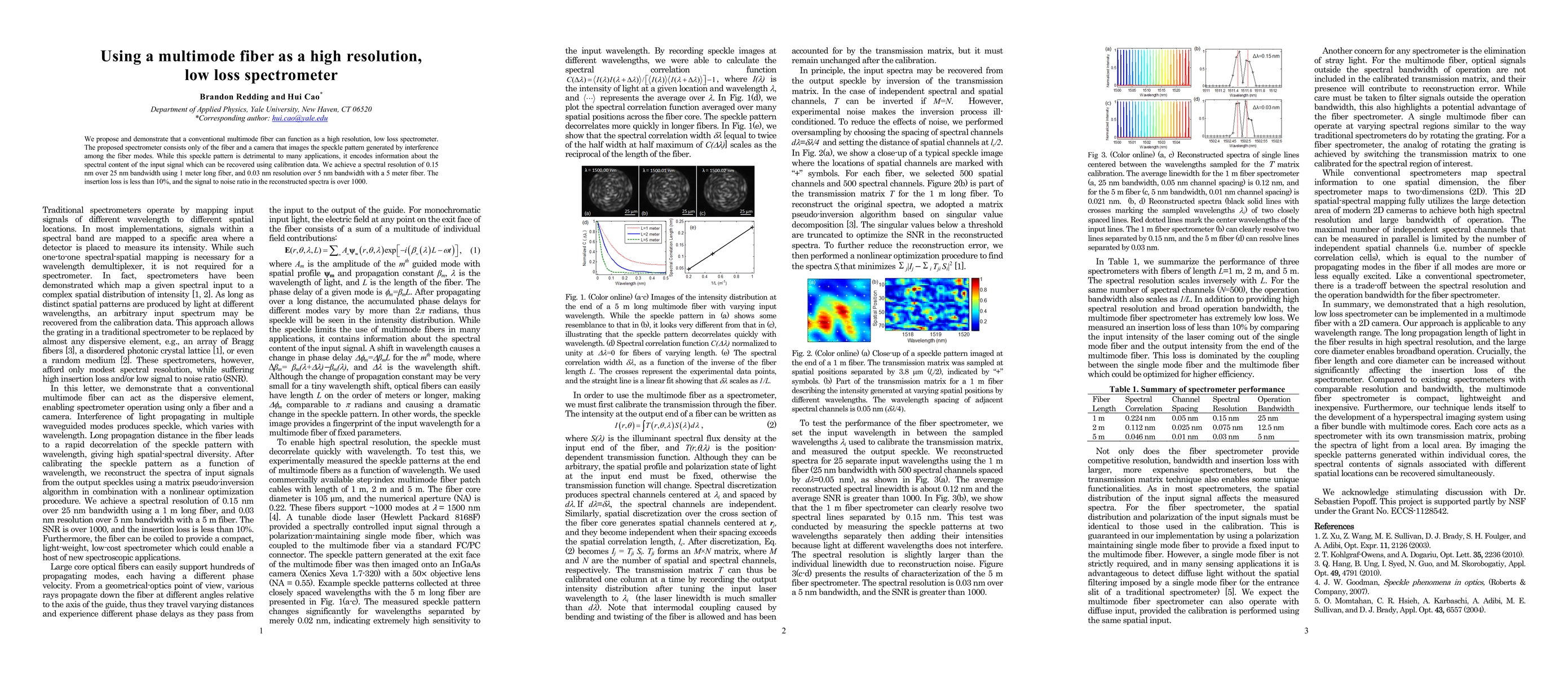 This paper demonstrates that a conventional multimode fiber can serve as a high-resolution, low-loss spectrometer by imaging the fiber's speckle pattern, which encodes spectral information. The method achieves resolutions of 0.15 nm over 25 nm and 0.03 nm over 5 nm, with insertion losses below 10% and a signal-to-noise ratio exceeding 1000.