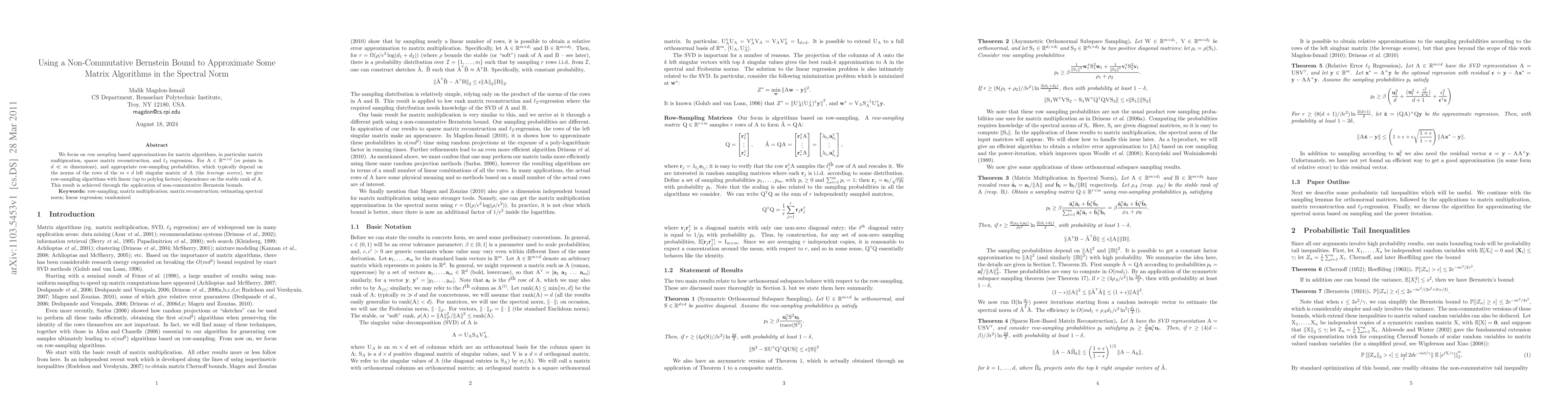 We focus on \emph{row sampling} based approximations for matrix algorithms, in particular matrix multipication, sparse matrix reconstruction, and \math{\ell_2} regression. For \math{\matA\in\R^{m\times d}} (\math{m} points in \math{d\ll m} dimensions), and appropriate row-sampling probabilities, which typically depend on the norms of the rows of the \math{m\times d} left singular matrix of \math{\matA} (the \emph{leverage scores}), we give row-sampling algorithms with linear (up to polylog factors) dependence on the stable rank of \math{\matA}. This result is achieved through the application of non-commutative Bernstein bounds. Keywords: row-sampling; matrix multiplication; matrix reconstruction; estimating spectral norm; linear regression; randomized