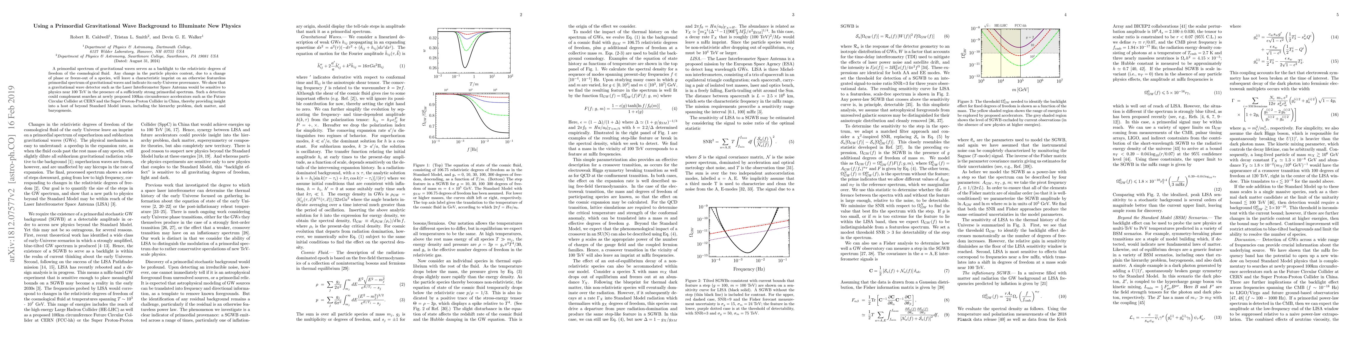 A primordial spectrum of gravitational waves serves as a backlight to the relativistic degrees of freedom of the cosmological fluid. Any change in the particle physics content, due to a change of phase or freeze-out of a species, will leave a characteristic imprint on an otherwise featureless primordial spectrum of gravitational waves and indicate its early-Universe provenance. We show that a gravitational wave detector such as the Laser Interferometer Space Antenna would be sensitive to physics near 100 TeV in the presence of a sufficiently strong primordial spectrum. Such a detection could complement searches at newly proposed 100 km circumference accelerators such as the Future Circular Collider at CERN and the Super Proton-Proton Collider in China, thereby providing insight into a host of beyond Standard Model issues, including the hierarchy problem, dark matter, and baryogenesis.