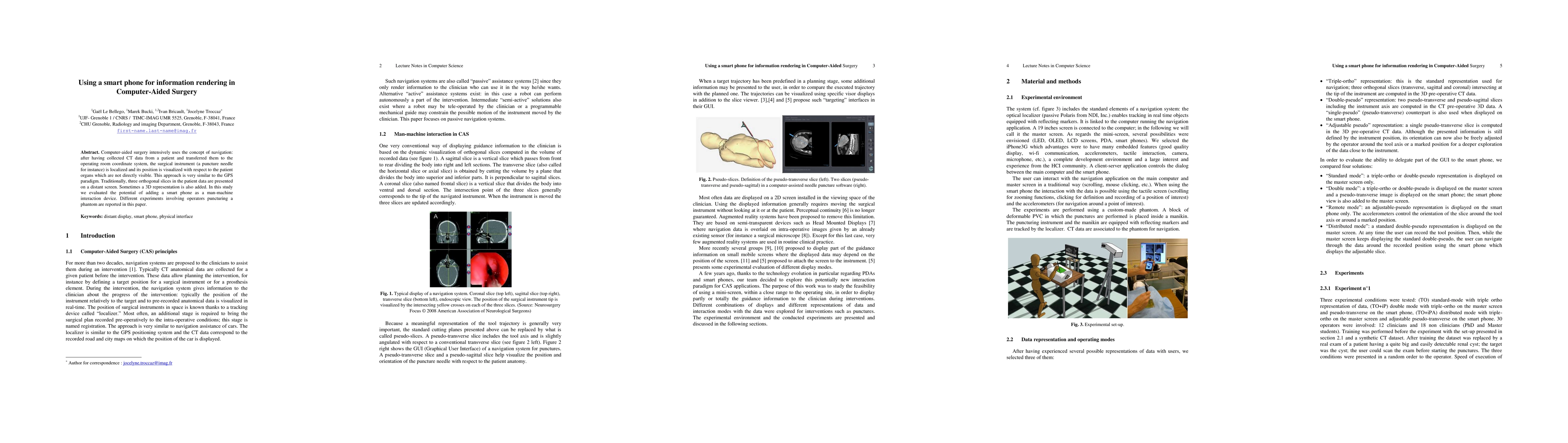 This study evaluates the use of a smartphone for enhanced navigation in computer-aided surgery, comparing traditional distant screen displays with smartphone-based visualization. Experiments show improved operator performance using the smartphone interface for puncturing a phantom.