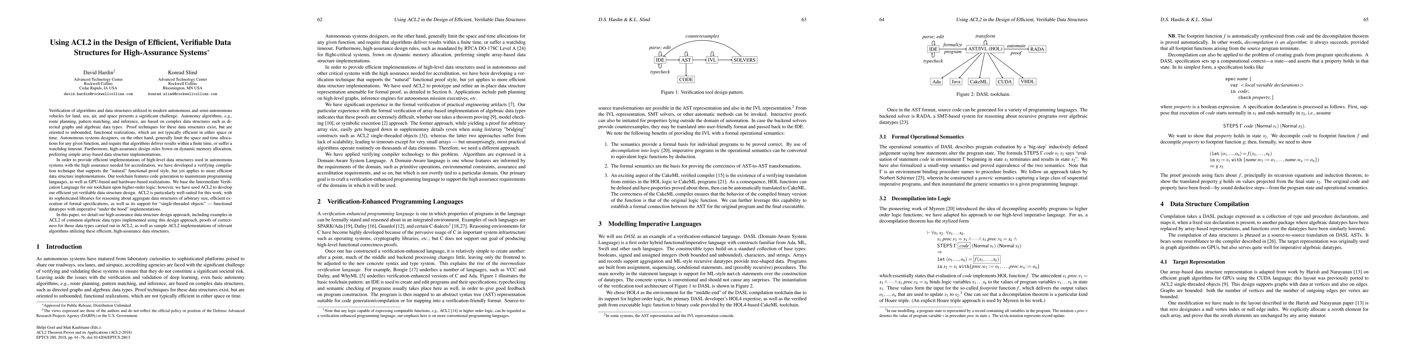 This paper presents a verifying compilation technique using ACL2 to design efficient, verifiable data structures for high-assurance autonomous systems, addressing the challenge of balancing efficiency with formal verification. The authors demonstrate ACL2's suitability for implementing and proving the correctness of these data structures.