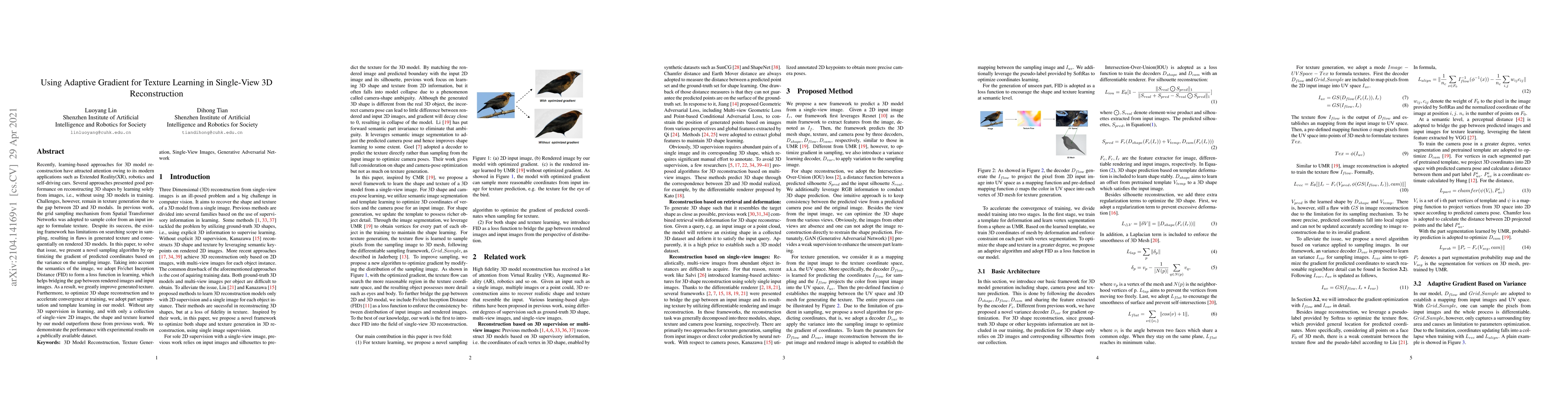This paper proposes an adaptive gradient-based sampling algorithm to enhance texture learning for single-view 3D reconstruction, addressing limitations in previous grid sampling methods. The approach optimizes gradient for predicted coordinates, utilizes FID for loss function, and incorporates part segmentation and template learning to improve both texture and shape reconstruction without 3D supervision.