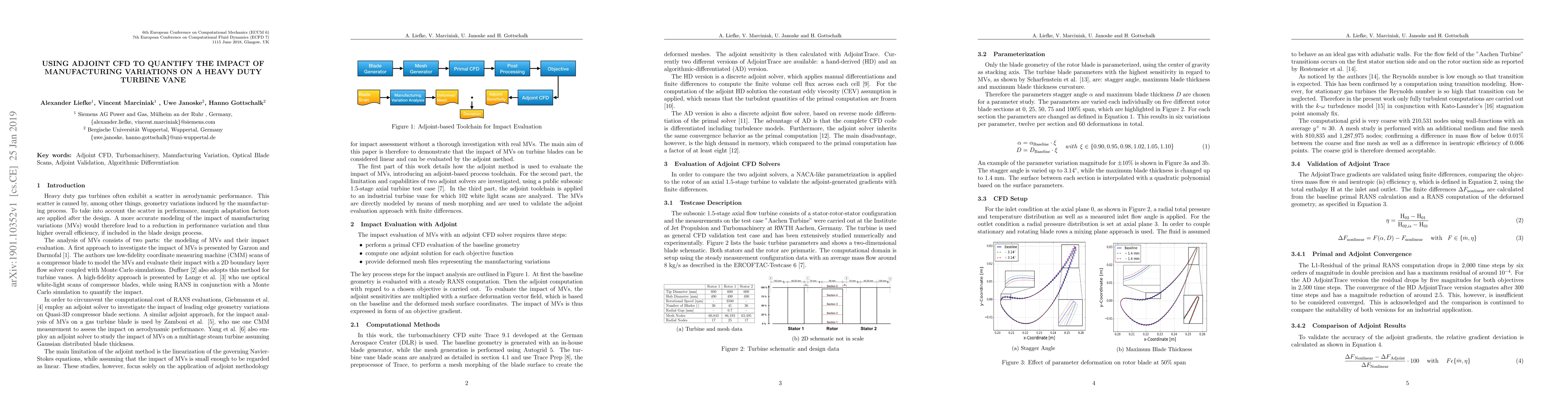 Summary: The paper uses adjoint computational fluid dynamics (CFD) to assess the impact of manufacturing variations on the aerodynamic performance of turbine vanes, finding high correlation between adjoint and finite difference method calculations based on empirical data from 102 white light scans.