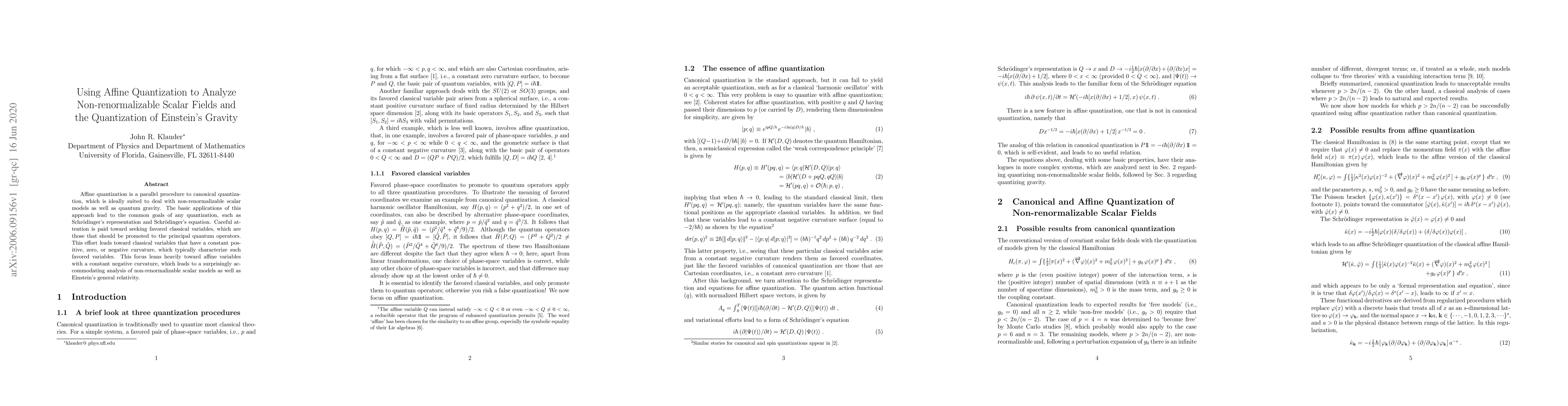 Affine quantization is a parallel procedure to canonical quantization, which is ideally suited to deal with non-renormalizable scalar models as well as quantum gravity. The basic applications of this approach lead to the common goals of any quantization, such as Schroedinger's representation and Schroedinger's equation. Careful attention is paid toward seeking favored classical variables, which are those that should be promoted to the principal quantum operators. This effort leads toward classical variables that have a constant positive, zero, or negative curvature, which typically characterize such favored variables. This focus leans heavily toward affine variables with a constant negative curvature, which leads to a surprisingly accommodating analysis of non-renormalizable scalar models as well as Einstein's general relativity.