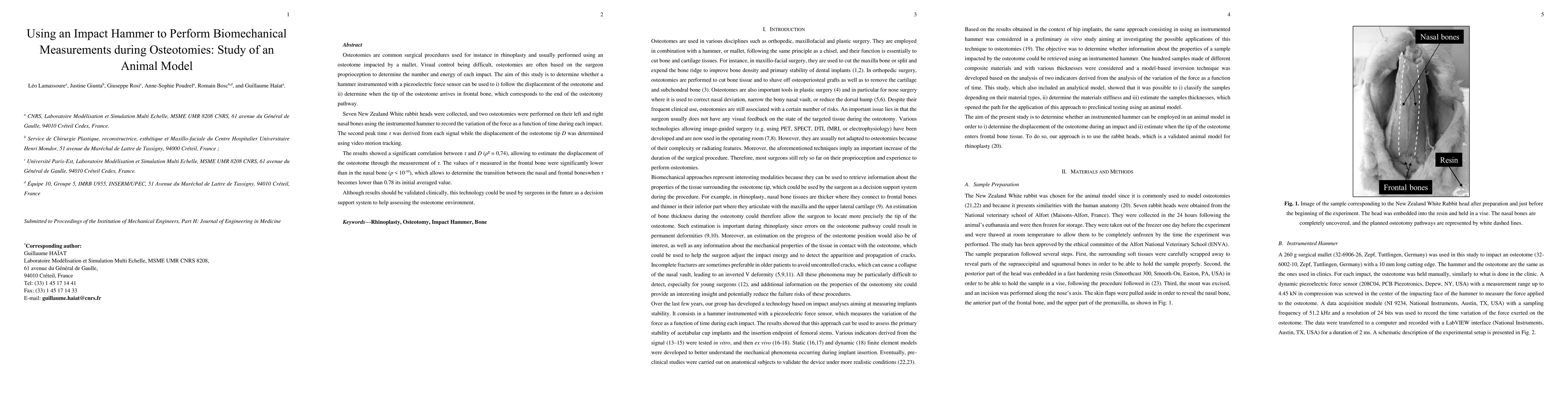 Osteotomies are common surgical procedures used for instance in rhinoplasty and usually performed using an osteotome impacted by a mallet. Visual control being difficult, osteotomies are often based on the surgeon proprioception to determine the number and energy of each impact. The aim of this study is to determine whether a hammer instrumented with a piezoelectric force sensor can be used to i) follow the displacement of the osteotome and ii) determine when the tip of the osteotome arrives in frontal bone, which corresponds to the end of the osteotomy pathway. Seven New Zealand White rabbit heads were collected, and two osteotomies were performed on their left and right nasal bones using the instrumented hammer to record the variation of the force as a function of time during each impact. The second peak time $\tau$ was derived from each signal while the displacement of the osteotome tip D was determined using video motion tracking. The results showed a significant correlation between $\tau$ and D ($\rho$${}^2$ = 0,74), allowing to estimate the displacement of the osteotome through the measurement of $\tau$. The values of $\tau$ measured in the frontal bone were significantly lower than in the nasal bone (p < 10-10), which allows to determine the transition between the nasal and frontal boneswhen $\tau$ becomes lower than 0.78 its initial averaged value. Although results should be validated clinically, this technology could be used by surgeons in the future as a decision support system to help assessing the osteotome environment.