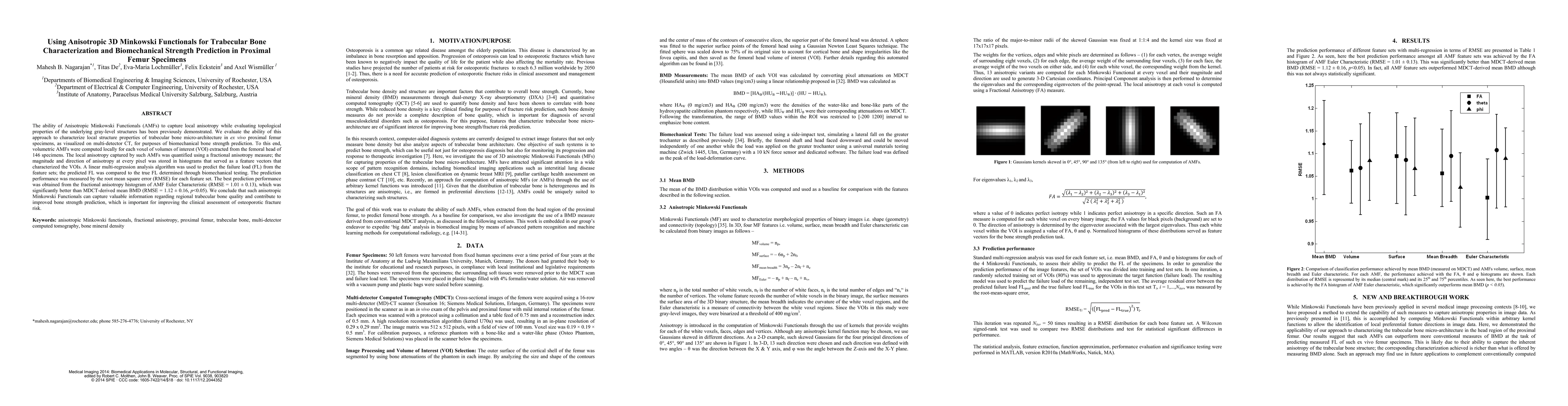 Researchers used anisotropic 3D Minkowski functionals to analyze trabecular bone micro-architecture in proximal femur specimens and found a strong correlation between these analyses and predicted biomechanical bone strength.