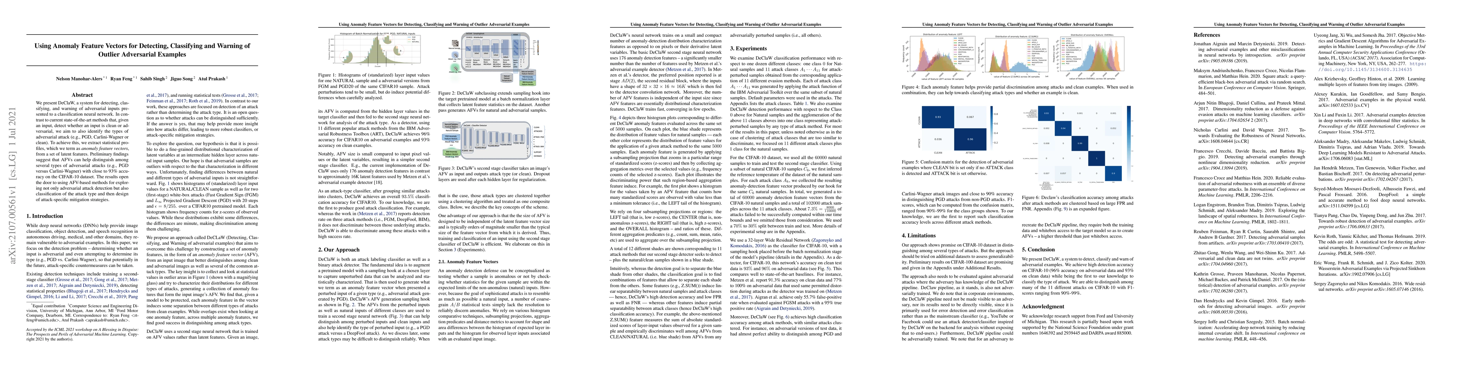 The DeClaW system detects, classifies, and warns of adversarial examples in neural networks using anomaly feature vectors derived from latent features, achieving near 93% accuracy in distinguishing between attack types on CIFAR-10. This approach enables the exploration of attack-specific mitigation strategies.