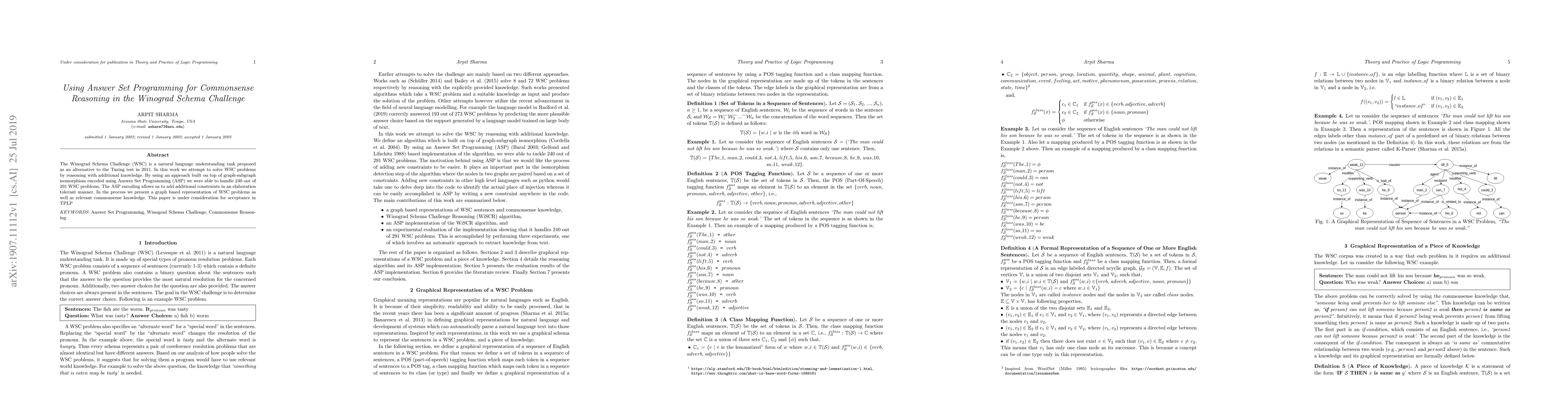 This paper introduces an approach using Answer Set Programming (ASP) to tackle the Winograd Schema Challenge (WSC), a complex natural language understanding task. The method, which leverages graph-subgraph isomorphism and commonsense knowledge, successfully addressed 240 out of 291 WSC problems, demonstrating a promising avenue for commonsense reasoning in AI.