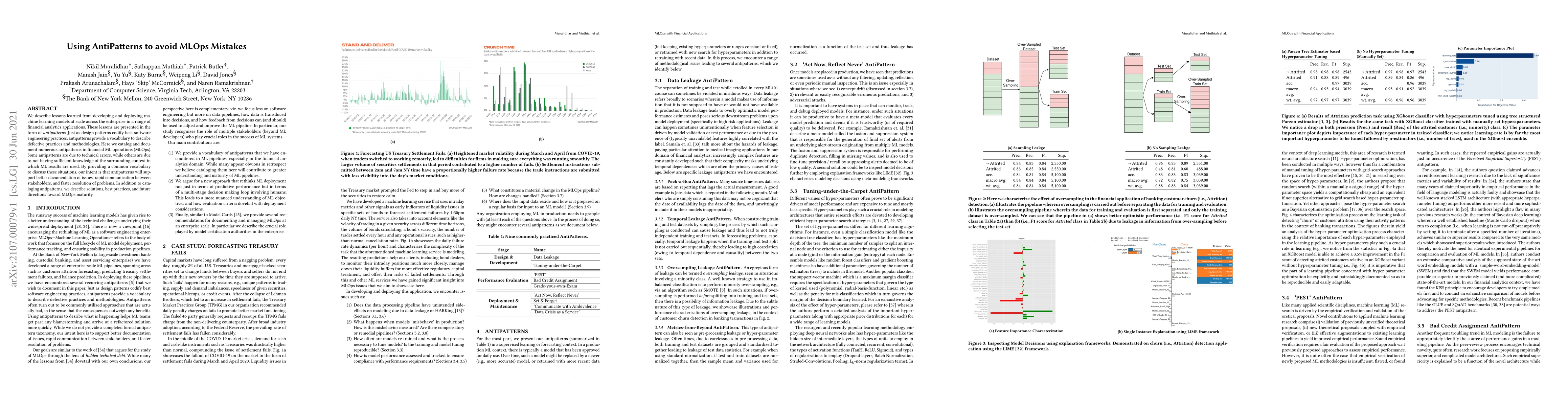 This paper catalogs antipatterns identified in financial MLOps, detailing common mistakes made during the development and deployment of machine learning models. It aims to improve communication and problem resolution by providing a shared vocabulary for defective practices, alongside solutions and best practices for advancing MLOps maturity.