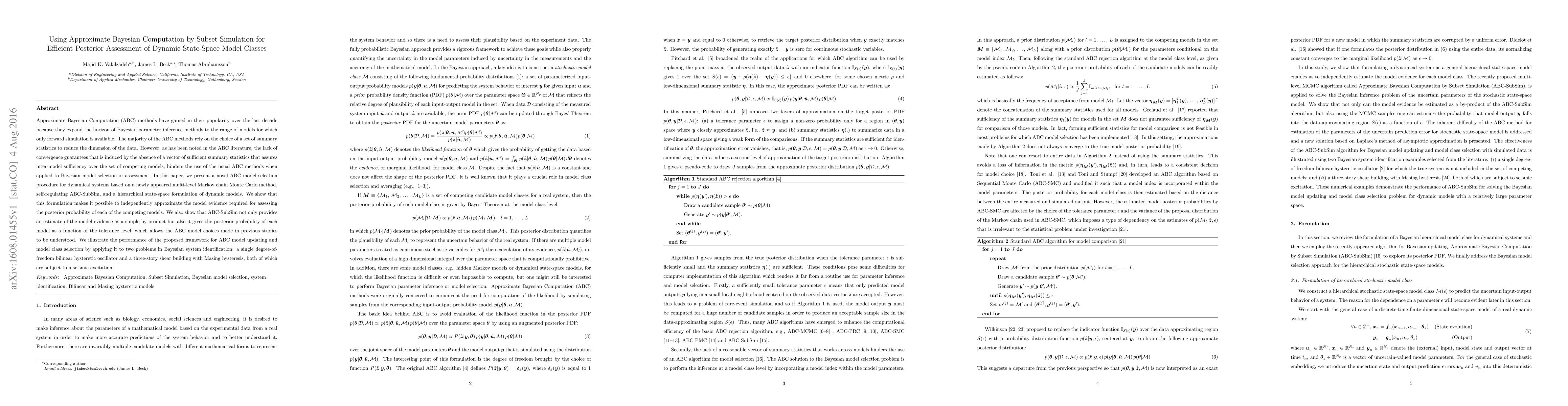 Approximate Bayesian Computation (ABC) methods have gained in their popularity over the last decade because they expand the horizon of Bayesian parameter inference methods to the range of models for which only forward simulation is available. The majority of the ABC methods rely on the choice of a set of summary statistics to reduce the dimension of the data. However, as has been noted in the ABC literature, the lack of convergence guarantees that is induced by the absence of a vector of sufficient summary statistics that assures inter-model sufficiency over the set of competing models, hinders the use of the usual ABC methods when applied to Bayesian model selection or assessment. In this paper, we present a novel ABC model selection procedure for dynamical systems based on a newly appeared multi-level Markov chain Monte Carlo method, self-regulating ABC-SubSim, and a hierarchical state-space formulation of dynamic models. We show that this formulation makes it possible to independently approximate the model evidence required for assessing the posterior probability of each of the competing models. We also show that ABC-SubSim not only provides an estimate of the model evidence as a simple by-product but also it gives the posterior probability of each model as a function of the tolerance level, which allows the ABC model choices made in previous studies to be understood. We illustrate the performance of the proposed framework for ABC model updating and model class selection by applying it to two problems in Bayesian system identification: a single degree-of-freedom bilinear hysteretic oscillator and a three-story shear building with Masing hysteresis, both of which are subject to a seismic excitation.