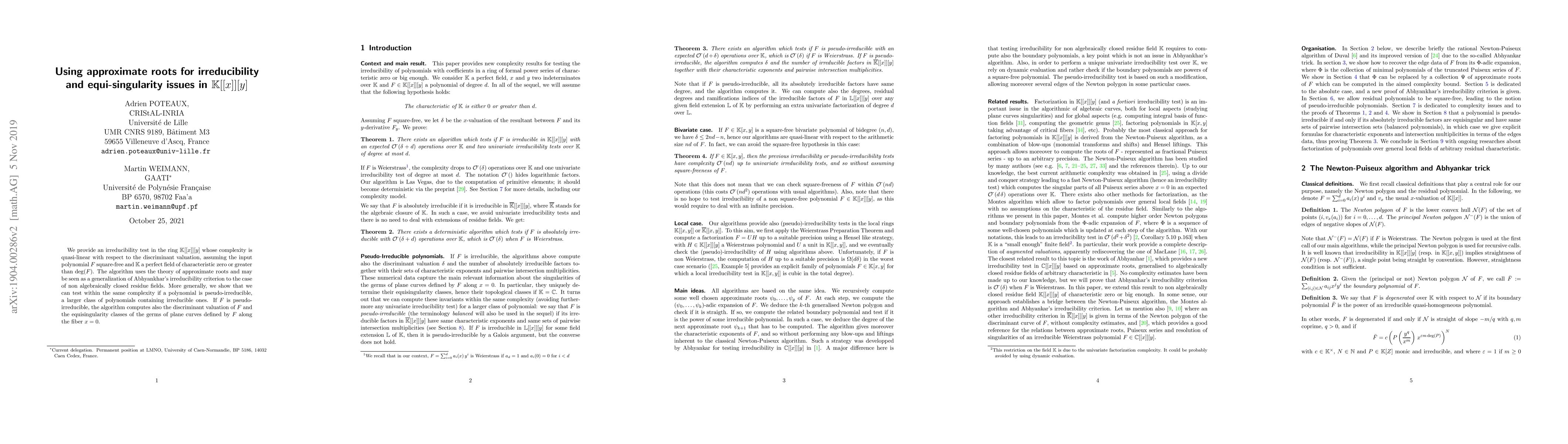 We provide an irreducibility test in the ring K[[x]][y] whose complexity is quasi-linear with respect to the valuation of the discriminant, assuming the input polynomial F square-free and K a perfect field of characteristic zero or greater than deg(F). The algorithm uses the theory of approximate roots and may be seen as a generalization of Abhyankhar's irreducibility criterion to the case of non algebraically closed residue fields. More generally, we show that we can test within the same complexity if a polynomial is pseudo-irreducible, a larger class of polynomials containing irreducible ones. If $F$ is pseudo-irreducible, the algorithm computes also the valuation of the discriminant and the equisingularity types of the germs of plane curve defined by F along the fiber x=0.