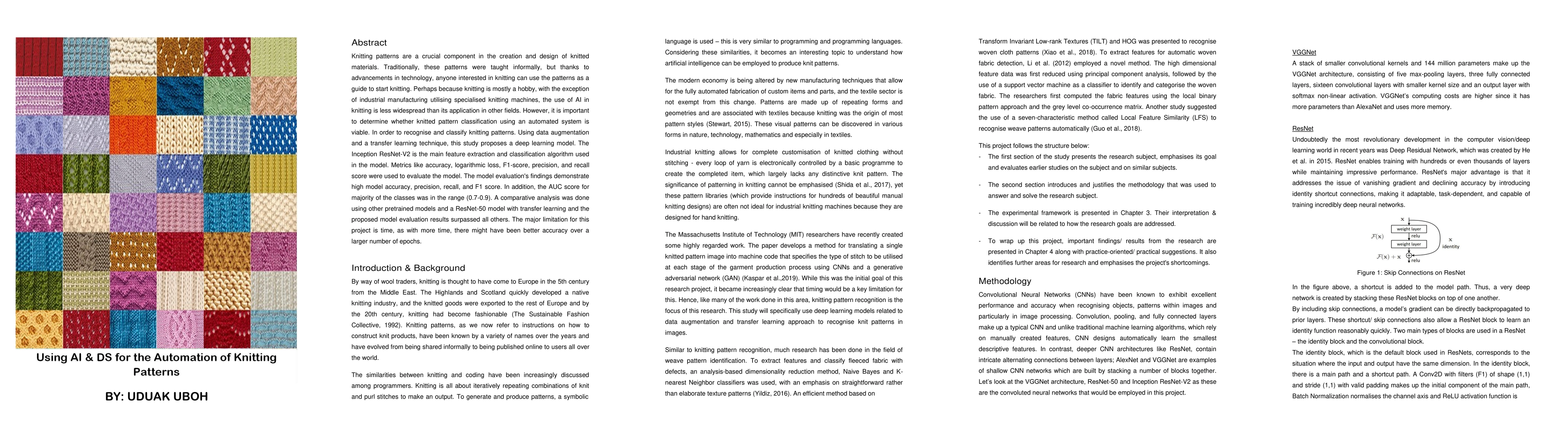 This study explores the viability of using AI to automate the classification of knitting patterns through a deep learning model employing Inception ResNet-V2. The model achieved high accuracy, precision, recall, and F1 scores, outperforming comparative models, though time constraints limited further improvements.