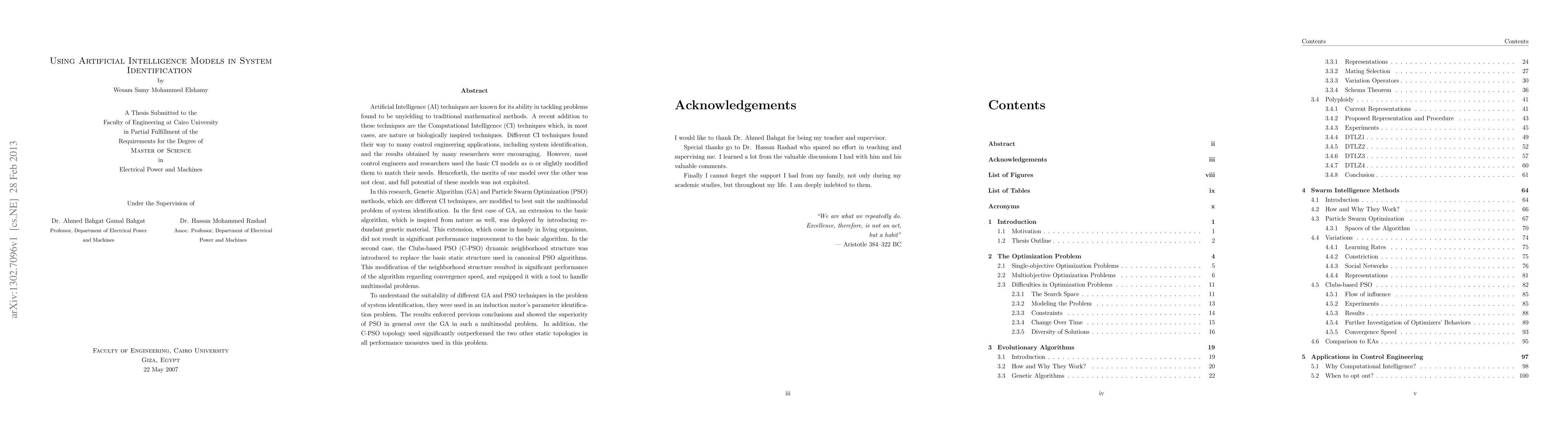 Artificial Intelligence (AI) techniques are known for its ability in tackling problems found to be unyielding to traditional mathematical methods. A recent addition to these techniques are the Computational Intelligence (CI) techniques which, in most cases, are nature or biologically inspired techniques. Different CI techniques found their way to many control engineering applications, including system identification, and the results obtained by many researchers were encouraging. However, most control engineers and researchers used the basic CI models as is or slightly modified them to match their needs. Henceforth, the merits of one model over the other was not clear, and full potential of these models was not exploited. In this research, Genetic Algorithm (GA) and Particle Swarm Optimization (PSO) methods, which are different CI techniques, are modified to best suit the multimodal problem of system identification. In the first case of GA, an extension to the basic algorithm, which is inspired from nature as well, was deployed by introducing redundant genetic material. This extension, which come in handy in living organisms, did not result in significant performance improvement to the basic algorithm. In the second case, the Clubs-based PSO (C-PSO) dynamic neighborhood structure was introduced to replace the basic static structure used in canonical PSO algorithms. This modification of the neighborhood structure resulted in significant performance of the algorithm regarding convergence speed, and equipped it with a tool to handle multimodal problems. To understand the suitability of different GA and PSO techniques in the problem of system identification, they were used in an induction motor's parameter identification problem. The results enforced previous conclusions and showed the superiority of PSO in general over the GA in such a multimodal problem.