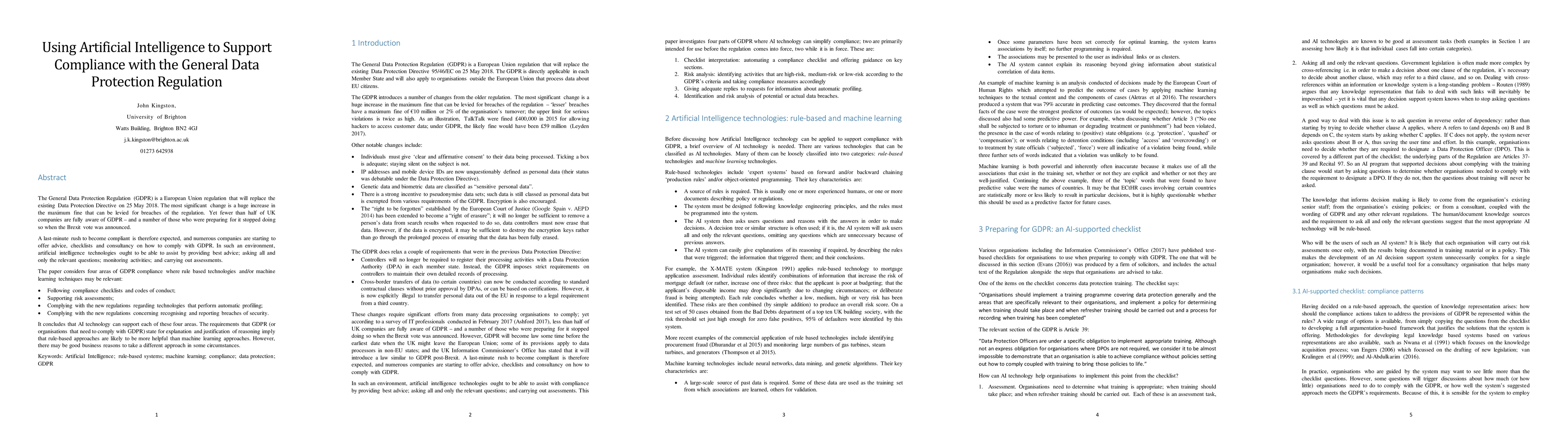 This paper explores how artificial intelligence can assist UK companies in complying with GDPR, focusing on four areas: compliance checklists, risk assessments, automatic profiling, and security breach reporting. It concludes that rule-based AI technologies are more suitable for explaining compliance reasoning, though machine learning may be beneficial under certain business conditions.