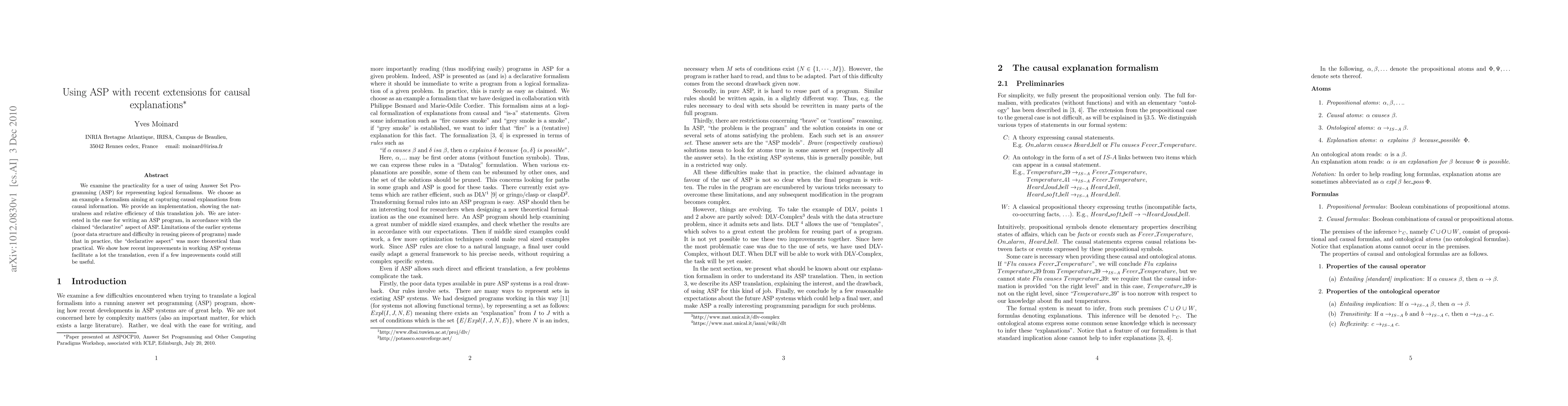We examine the practicality for a user of using Answer Set Programming (ASP) for representing logical formalisms. We choose as an example a formalism aiming at capturing causal explanations from causal information. We provide an implementation, showing the naturalness and relative efficiency of this translation job. We are interested in the ease for writing an ASP program, in accordance with the claimed ``declarative'' aspect of ASP. Limitations of the earlier systems (poor data structure and difficulty in reusing pieces of programs) made that in practice, the ``declarative aspect'' was more theoretical than practical. We show how recent improvements in working ASP systems facilitate a lot the translation, even if a few improvements could still be useful.