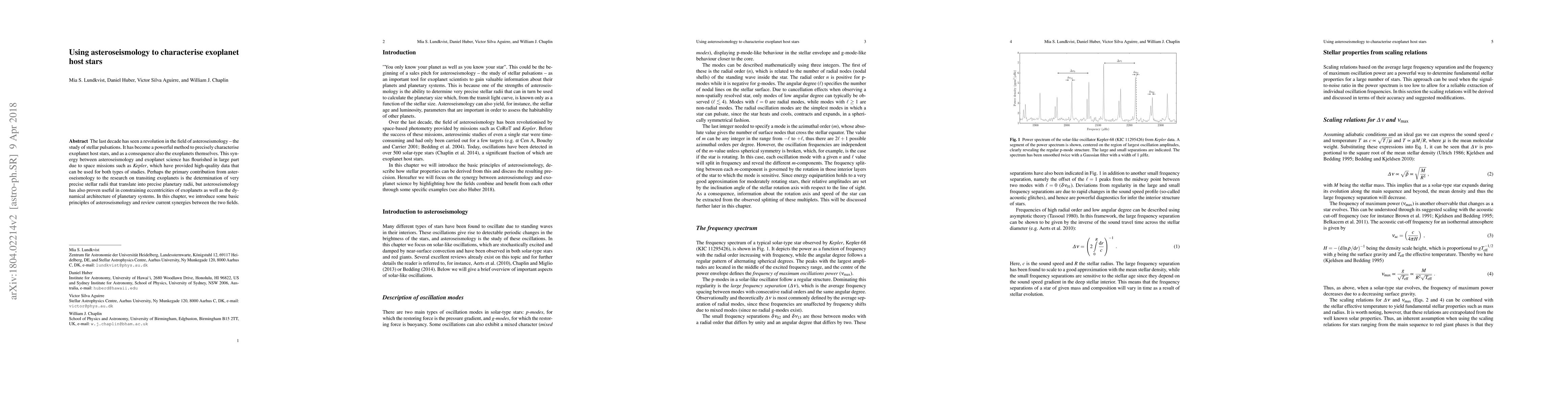 The last decade has seen a revolution in the field of asteroseismology - the study of stellar pulsations. It has become a powerful method to precisely characterise exoplanet host stars, and as a consequence also the exoplanets themselves. This synergy between asteroseismology and exoplanet science has flourished in large part due to space missions such as $\textit{Kepler}$, which have provided high-quality data that can be used for both types of studies. Perhaps the primary contribution from asteroseismology to the research on transiting exoplanets is the determination of very precise stellar radii that translate into precise planetary radii, but asteroseismology has also proven useful in constraining eccentricities of exoplanets as well as the dynamical architecture of planetary systems. In this contribution, we introduce some basic principles of asteroseismology and review current synergies between the two fields.