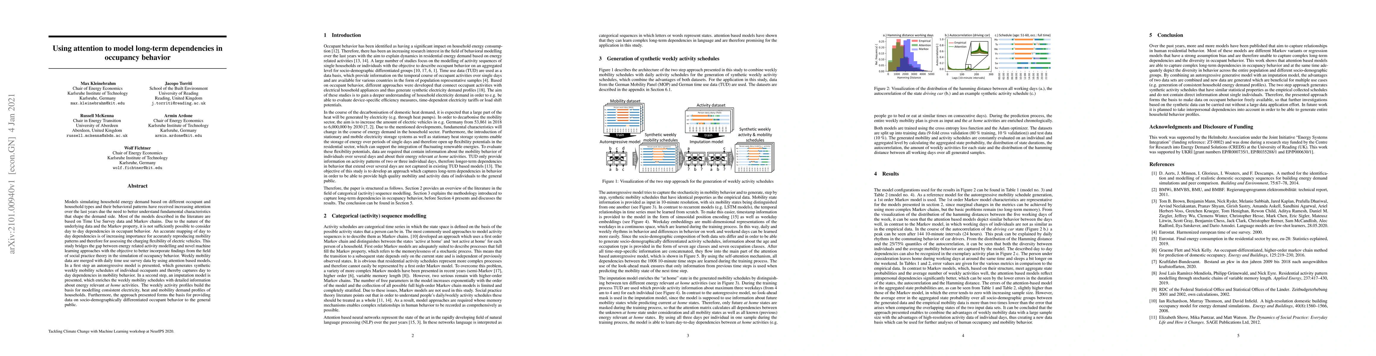Models simulating household energy demand based on different occupant and household types and their behavioral patterns have received increasing attention over the last years due the need to better understand fundamental characteristics that shape the demand side. Most of the models described in the literature are based on Time Use Survey data and Markov chains. Due to the nature of the underlying data and the Markov property, it is not sufficiently possible to consider day to day dependencies in occupant behavior. An accurate mapping of day to day dependencies is of increasing importance for accurately reproducing mobility patterns and therefore for assessing the charging flexibility of electric vehicles. This study bridges the gap between energy related activity modelling and novel machine learning approaches with the objective to better incorporate findings from the field of social practice theory in the simulation of occupancy behavior. Weekly mobility data are merged with daily time use survey data by using attention based models. In a first step an autoregressive model is presented, which generates synthetic weekly mobility schedules of individual occupants and thereby captures day to day dependencies in mobility behavior. In a second step, an imputation model is presented, which enriches the weekly mobility schedules with detailed information about energy relevant at home activities. The weekly activity profiles build the basis for modelling consistent electricity, heat and mobility demand profiles of households. Furthermore, the approach presented forms the basis for providing data on socio-demographically differentiated occupant behavior to the general public.