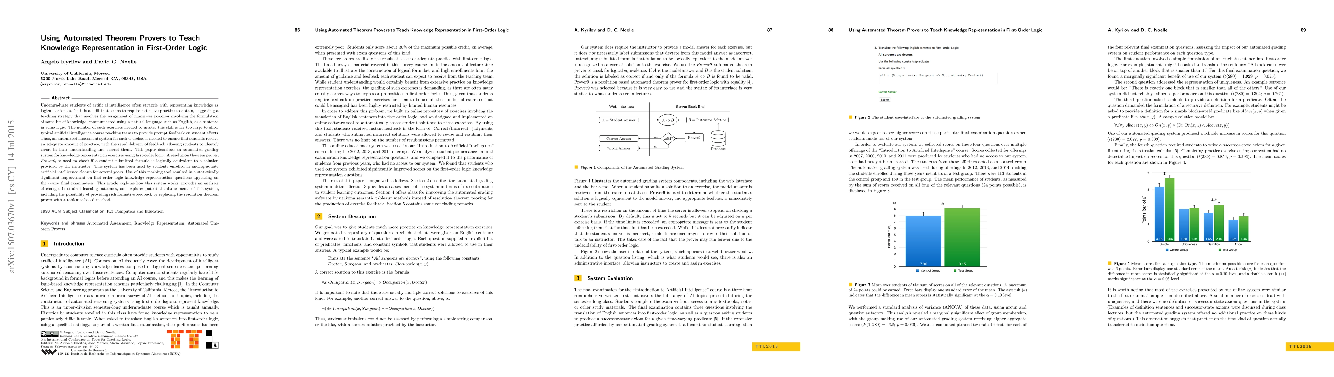 Undergraduate students of artificial intelligence often struggle with representing knowledge as logical sentences. This is a skill that seems to require extensive practice to obtain, suggesting a teaching strategy that involves the assignment of numerous exercises involving the formulation of some bit of knowledge, communicated using a natural language such as English, as a sentence in some logic. The number of such exercises needed to master this skill is far too large to allow typical artificial intelligence course teaching teams to provide prompt feedback on student efforts. Thus, an automated assessment system for such exercises is needed to ensure that students receive an adequate amount of practice, with the rapid delivery of feedback allowing students to identify errors in their understanding and correct them. This paper describes an automated grading system for knowledge representation exercises using first-order logic. A resolution theorem prover, \textit{Prover9}, is used to check if a student-submitted formula is logically equivalent to a solution provided by the instructor. This system has been used by students enrolled in undergraduate artificial intelligence classes for several years. Use of this teaching tool resulted in a statistically significant improvement on first-order logic knowledge representation questions appearing on the course final examination. This article explains how this system works, provides an analysis of changes in student learning outcomes, and explores potential enhancements of this system, including the possibility of providing rich formative feedback by replacing the resolution theorem prover with a tableaux-based method.