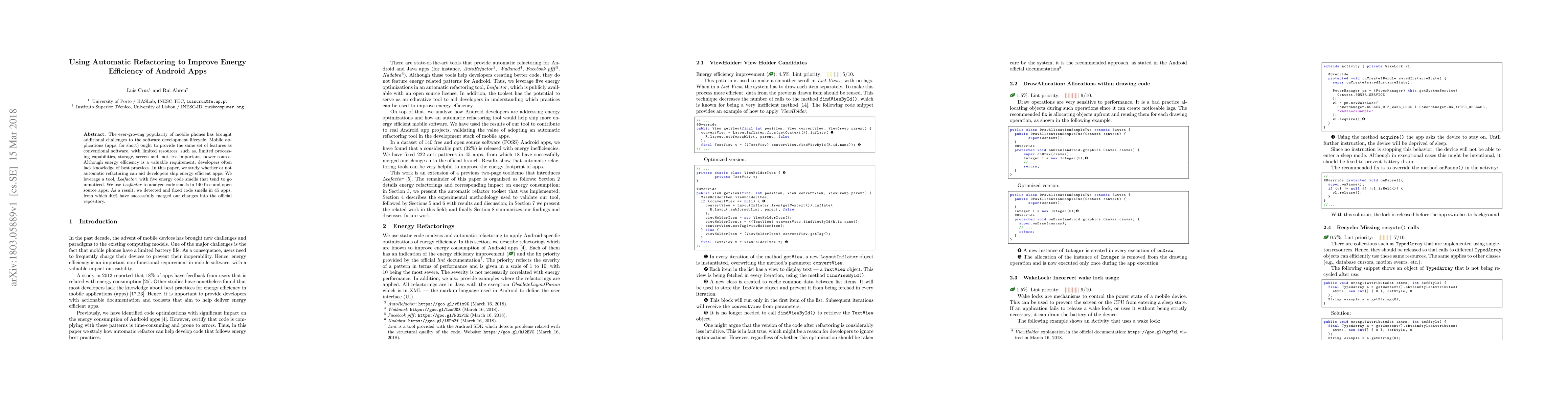 Researchers used automatic refactoring tool Leafactor to improve energy efficiency in Android apps by detecting and fixing common code smells. The study successfully merged changes into 40% of the modified apps' official repositories.