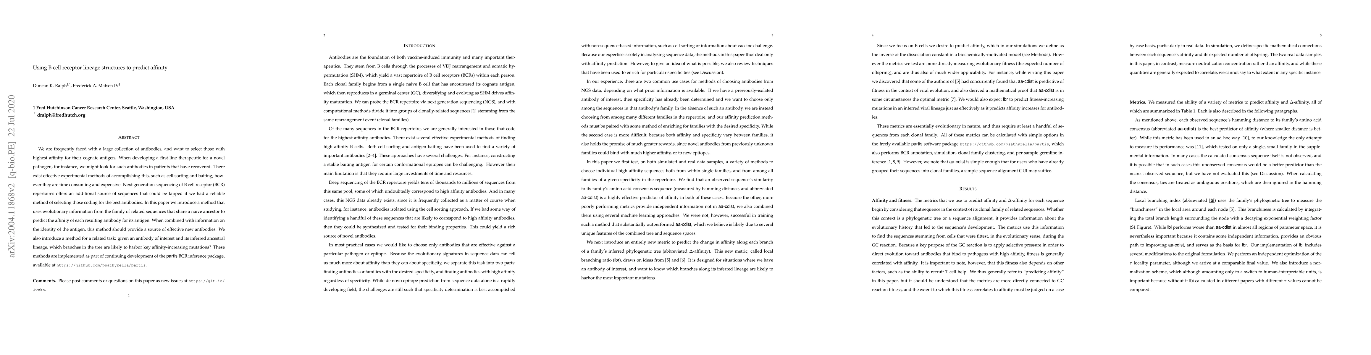 We are frequently faced with a large collection of antibodies, and want to select those with highest affinity for their cognate antigen. When developing a first-line therapeutic for a novel pathogen, for instance, we might look for such antibodies in patients that have recovered. There exist effective experimental methods of accomplishing this, such as cell sorting and baiting; however they are time consuming and expensive. Next generation sequencing of B cell receptor (BCR) repertoires offers an additional source of sequences that could be tapped if we had a reliable method of selecting those coding for the best antibodies. In this paper we introduce a method that uses evolutionary information from the family of related sequences that share a naive ancestor to predict the affinity of each resulting antibody for its antigen. When combined with information on the identity of the antigen, this method should provide a source of effective new antibodies. We also introduce a method for a related task: given an antibody of interest and its inferred ancestral lineage, which branches in the tree are likely to harbor key affinity-increasing mutations? These methods are implemented as part of continuing development of the partis BCR inference package, available at https://github.com/psathyrella/partis.