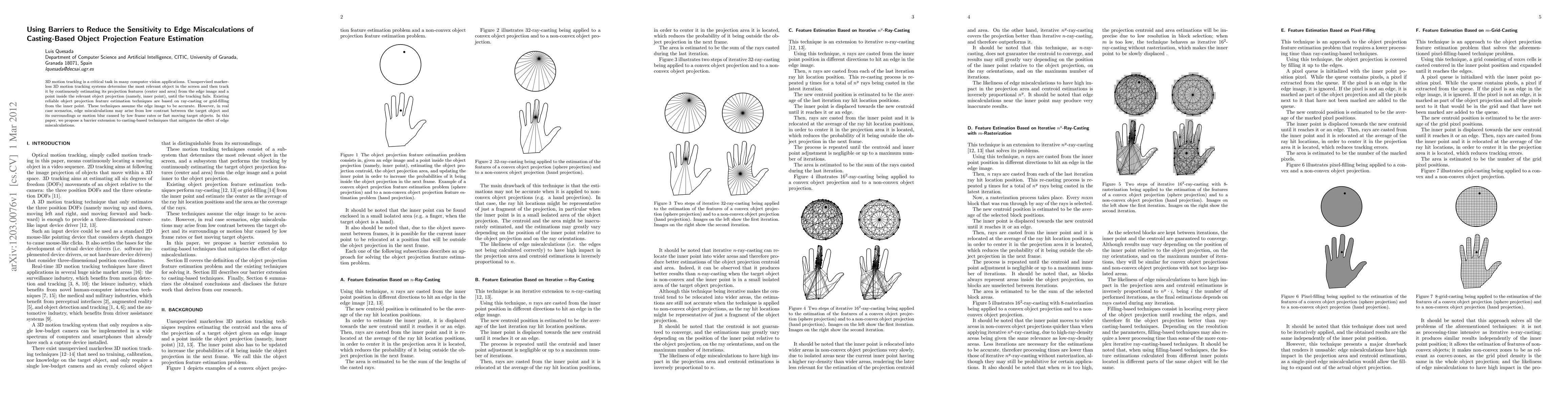 3D motion tracking is a critical task in many computer vision applications. Unsupervised markerless 3D motion tracking systems determine the most relevant object in the screen and then track it by continuously estimating its projection features (center and area) from the edge image and a point inside the relevant object projection (namely, inner point), until the tracking fails. Existing reliable object projection feature estimation techniques are based on ray-casting or grid-filling from the inner point. These techniques assume the edge image to be accurate. However, in real case scenarios, edge miscalculations may arise from low contrast between the target object and its surroundings or motion blur caused by low frame rates or fast moving target objects. In this paper, we propose a barrier extension to casting-based techniques that mitigates the effect of edge miscalculations.