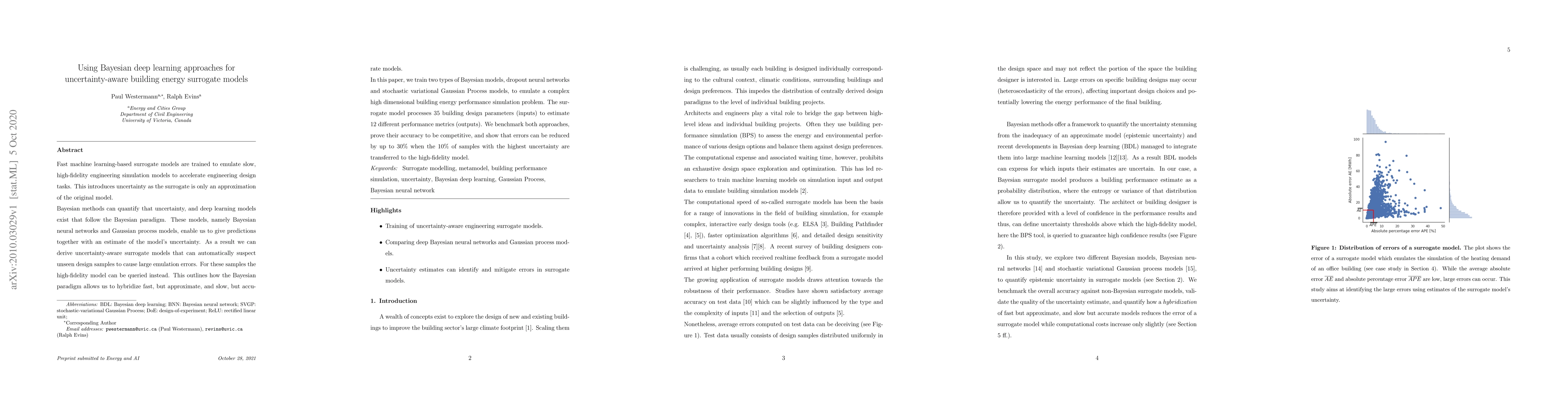 This paper explores Bayesian deep learning methods, specifically dropout neural networks and stochastic variational Gaussian Process models, to create uncertainty-aware surrogate models for building energy performance. The models reduce errors by up to 30% when high-uncertainty samples are processed by the high-fidelity model, demonstrating the effectiveness of hybridizing fast surrogates with accurate, albeit slow, simulations.