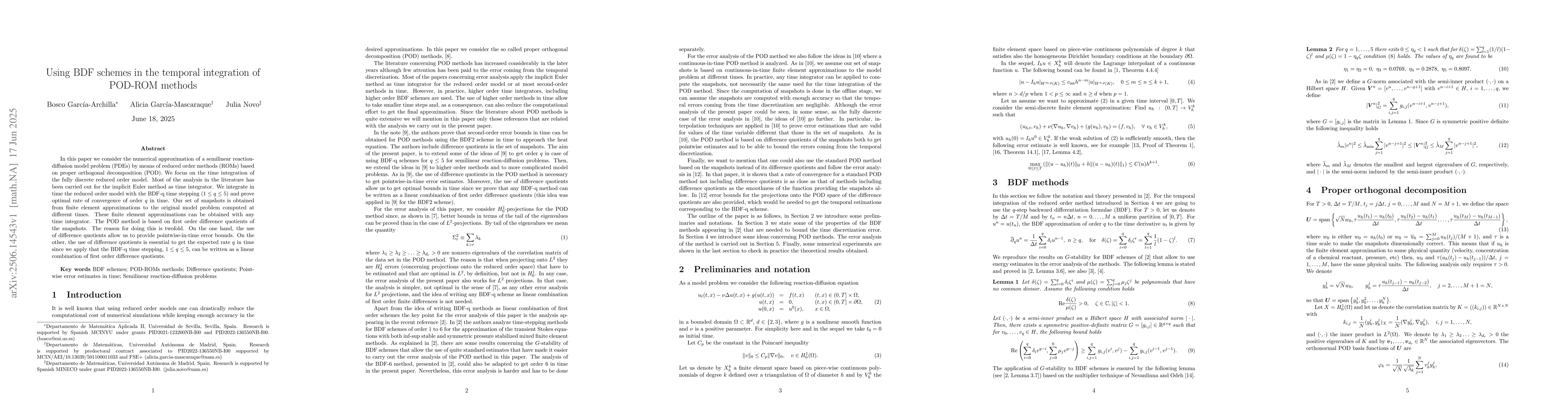 In this paper we consider the numerical approximation of a semilinear reaction-diffusion model problem (PDEs) by means of reduced order methods (ROMs) based on proper orthogonal decomposition (POD). We focus on the time integration of the fully discrete reduced order model. Most of the analysis in the literature has been carried out for the implicit Euler method as time integrator. We integrate in time the reduced order model with the BDF-q time stepping ($1\le q\le 5$) and prove optimal rate of convergence of order $q$ in time. Our set of snapshots is obtained from finite element approximations to the original model problem computed at different times. These finite element approximations can be obtained with any time integrator. The POD method is based on first order difference quotients of the snapshots. The reason for doing this is twofold. On the one hand, the use of difference quotients allow us to provide pointwise-in-time error bounds. On the other, the use of difference quotients is essential to get the expected rate $q$ in time since we apply that the BDF-q time stepping, $1\le q\le 5$, can be written as a linear combination of first order difference quotients.