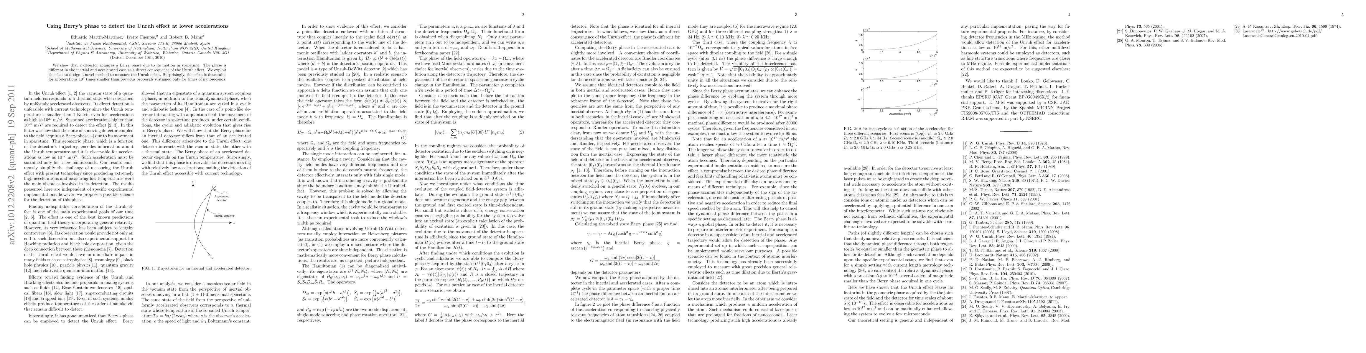 This paper proposes a novel method to detect the Unruh effect using Berry's phase, showing that it can be observed at accelerations 10^9 times lower than previously possible, thus extending the time frame for detection beyond nanoseconds.