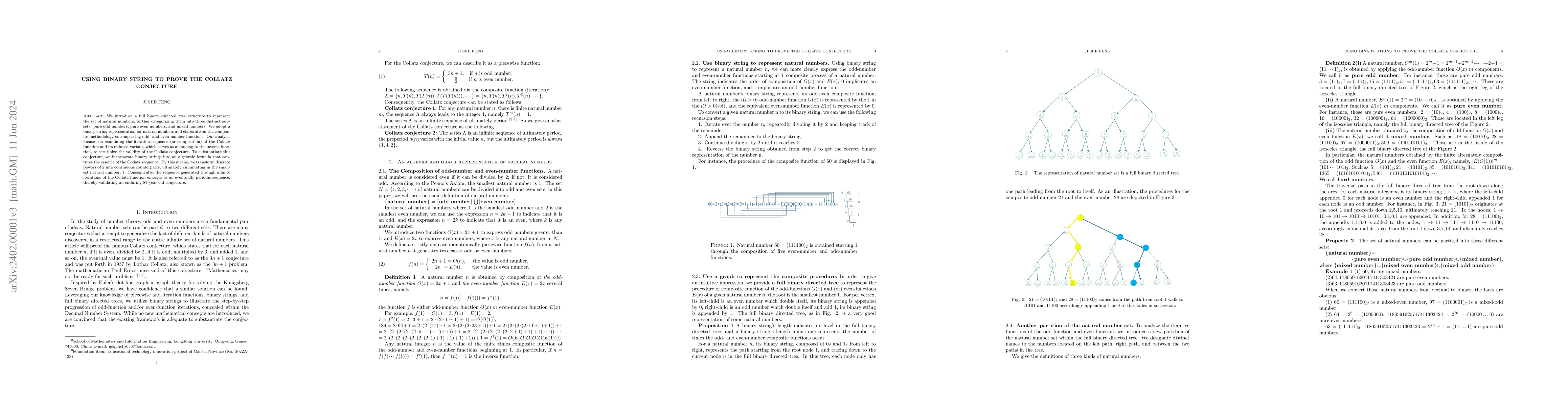We introduce a full binary directed tree structure to represent the set of natural numbers, further categorizing them into three distinct subsets: pure odd numbers, pure even numbers, and mixed numbers. We adopt a binary string representation for natural numbers and elaborate on the composite methodology encompassing odd- and even-number functions. Our analysis focuses on examining the iteration sequence (or composition) of the Collatz function and its reduced variant, which serves as an analog to the inverse function, to scrutinize the validity of the Collatz conjecture. To substantiate this conjecture, we incorporate binary strings into an algebraic formula that captures the essence of the Collatz sequence. By this means, we transform discrete powers of 2 into continuous counterparts, ultimately culminating in the smallest natural number, 1. Consequently, the sequence generated through infinite iterations of the Collatz function emerges as an eventually periodic sequence, thereby validating an enduring 87-year-old conjecture.