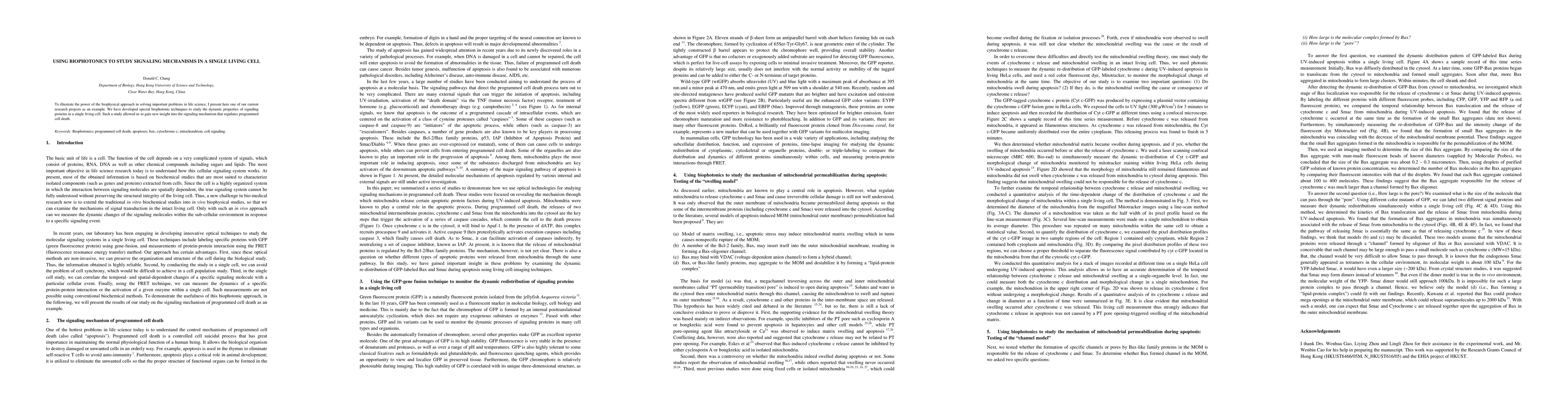 To illustrate the power of the biophysical approach in solving important problems in life science, I present here one of our current research projects as an example. We have developed special biophotonic techniques to study the dynamic properties of signaling proteins in a single living cell. Such a study allowed us to gain new insight into the signaling mechanism that regulates programmed cell death.