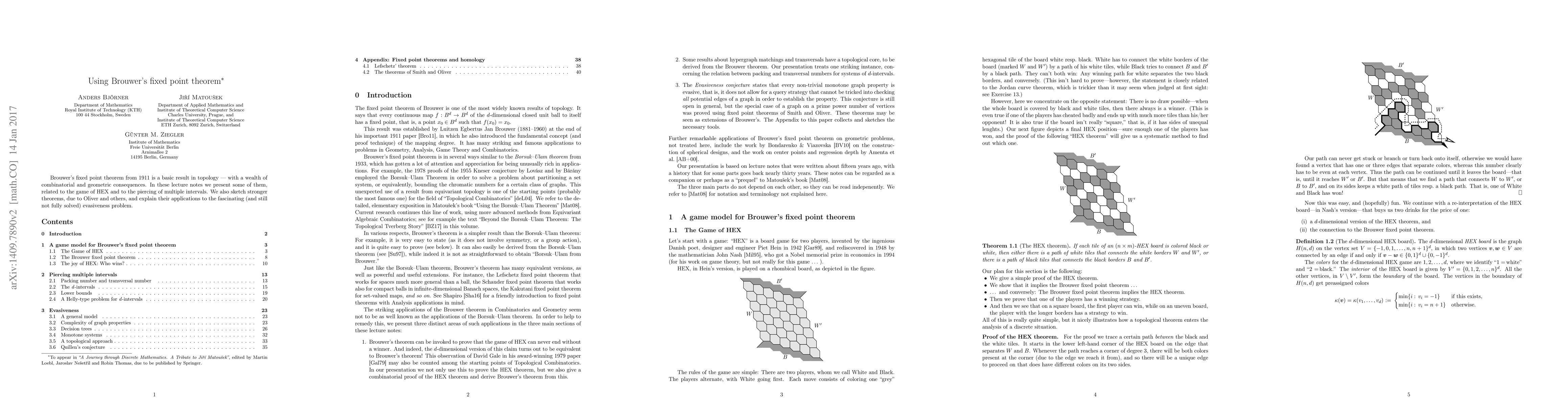 The paper utilizes Brouwer's fixed point theorem from topology to analyze various combinatorial and geometric consequences, with applications to the game of HEX and interval piercing problems.