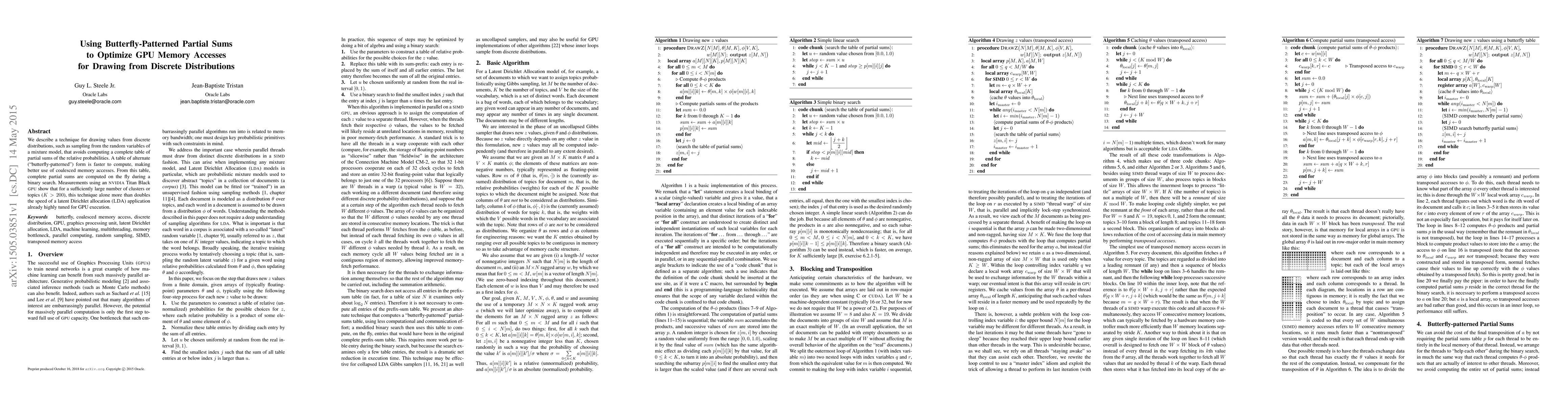 Researchers developed a technique to draw values from discrete distributions on GPUs, achieving a 2x speedup for large models (K > 200), by using a 'butterfly-patterned' table of partial sums.