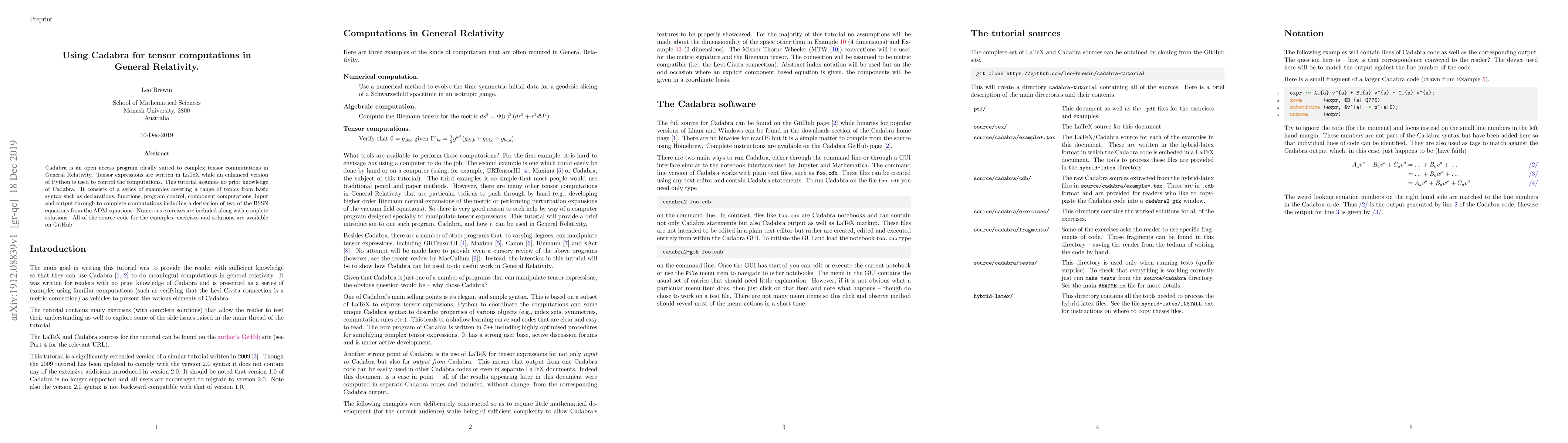 This paper introduces Cadabra, an open-access tool for complex tensor computations in General Relativity, using LaTeX for tensor expressions and an enhanced Python for computations. It provides a tutorial with exercises and solutions, demonstrating its application from basic syntax to deriving the BSSN equations from ADM equations.