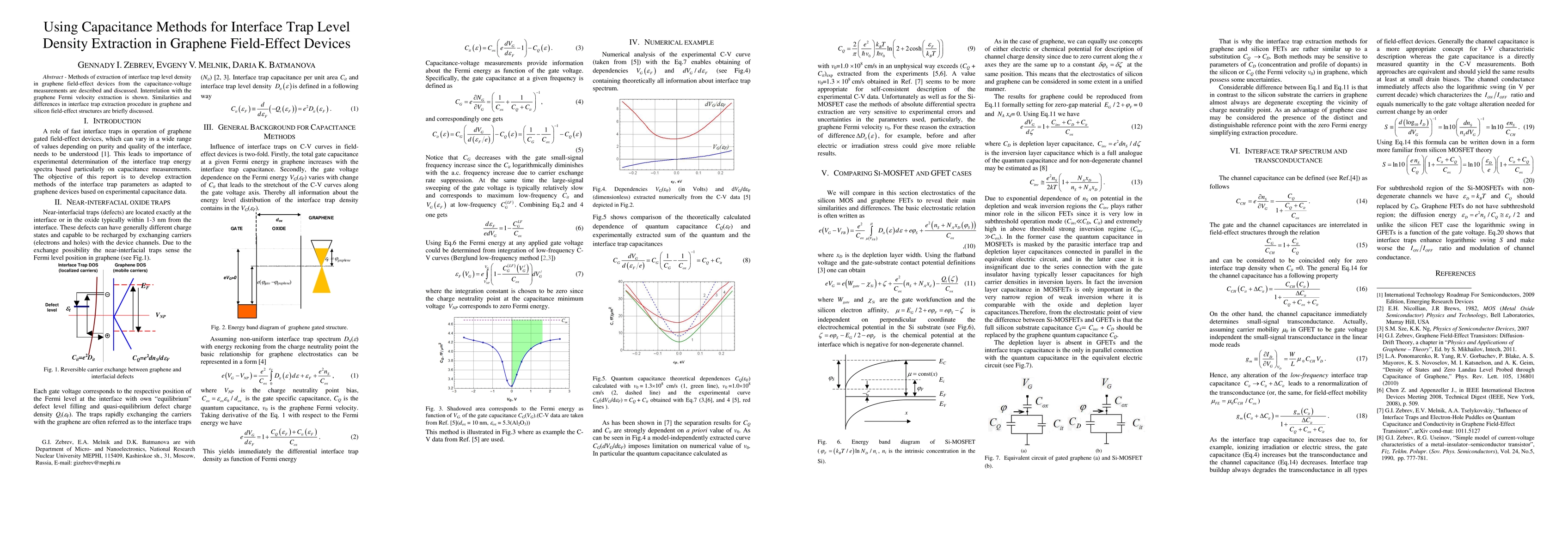This paper outlines methods for extracting interface trap level density in graphene field-effect devices using capacitance-voltage measurements, and demonstrates its correlation with graphene Fermi velocity. It also compares the procedure with that used in silicon field-effect structures.